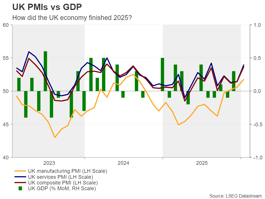 Thus, with the economy slowing down and the third quarter of 2025 undergoing sluggish growth, another round of soft data for Q4 could increase the chances of a March rate cut, pushing the British pound lower. However, it is worth mentioning that the improvement in the PMI data during the last three months of the year compared to Q3, is tilting the risks to the upside. The further PMI increases in January point to a healthier start of the new year.