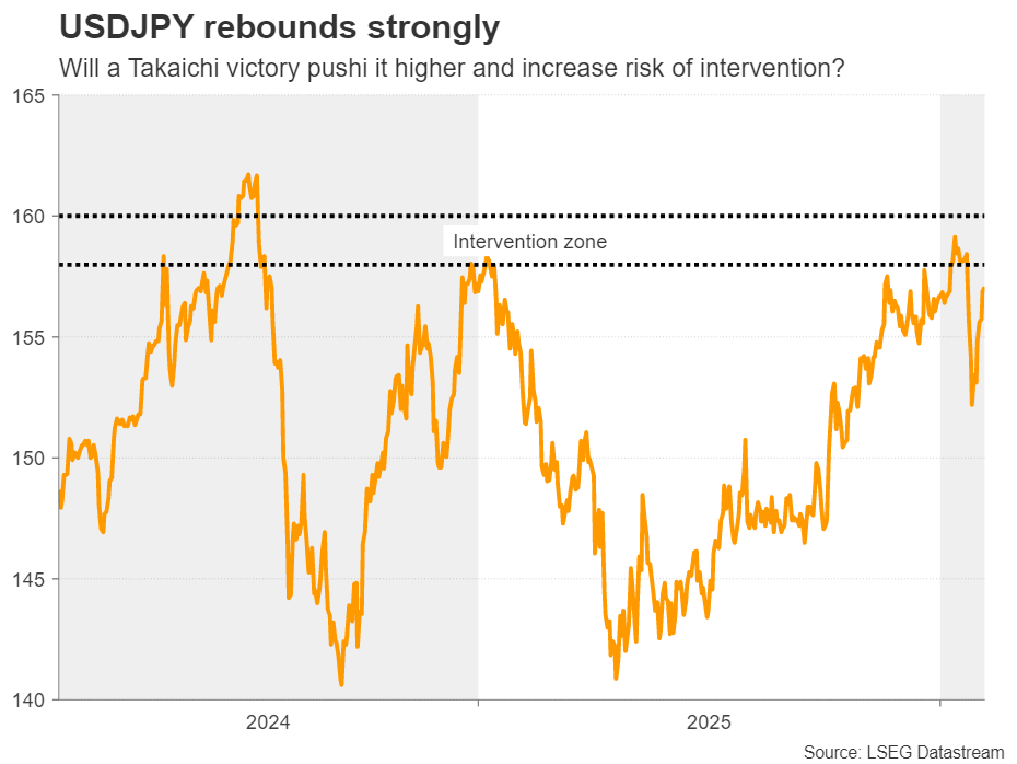 On the contrary, if Takaichi’s coalition does not secure a majority, the yen could strengthen as she pledged to step down. Political uncertainty could weigh on Japan’s stock market, and the yen could eventually attract safe-haven flows, supported by expectations of a less expansionary fiscal policy and a more hawkish BoJ stance down the road, even if there is an initial delay until a new governing coalition is formed.