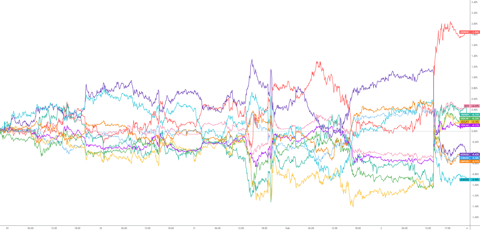 Traders also welcomed a slew of US jobs data last week, including increased Job Openings (increased to a little more than 9 million in December 2023; however, with the upward revision of the previous number to 8.93 million, there was little change), weak ADP employment growth (107,000), as well as a -0.4-percentage point drop in the ISM Manufacturing PMI employment component from 47.5 to 47.1 and weekly jobless filings jumping to 224k from a slightly upwardly revised 215k print. On top of this, Friday witnessed a monster beat on the non-farm payrolls release; the US economy added 353,000 new jobs in January, surpassing all estimates and breezing through the 216,000 jump in December. The unemployment rate remained unchanged at 3.7%, and the year-on-year earnings surged to 4.5% (M/M rose 0.6%), smashing through all estimates and the prior (4.1%).