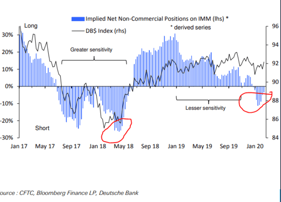 This is essentially the "cleanest dirty shirt" argument for owning US assets, which is particularly salient at the moment given the likely asymmetric growth impact of the coronavirus shock. At present, the growth impact of the virus remains expected to be more severe in China (and hence in Germany) than in the US. Which, in turn, is providing massive inflows into the US dollar.