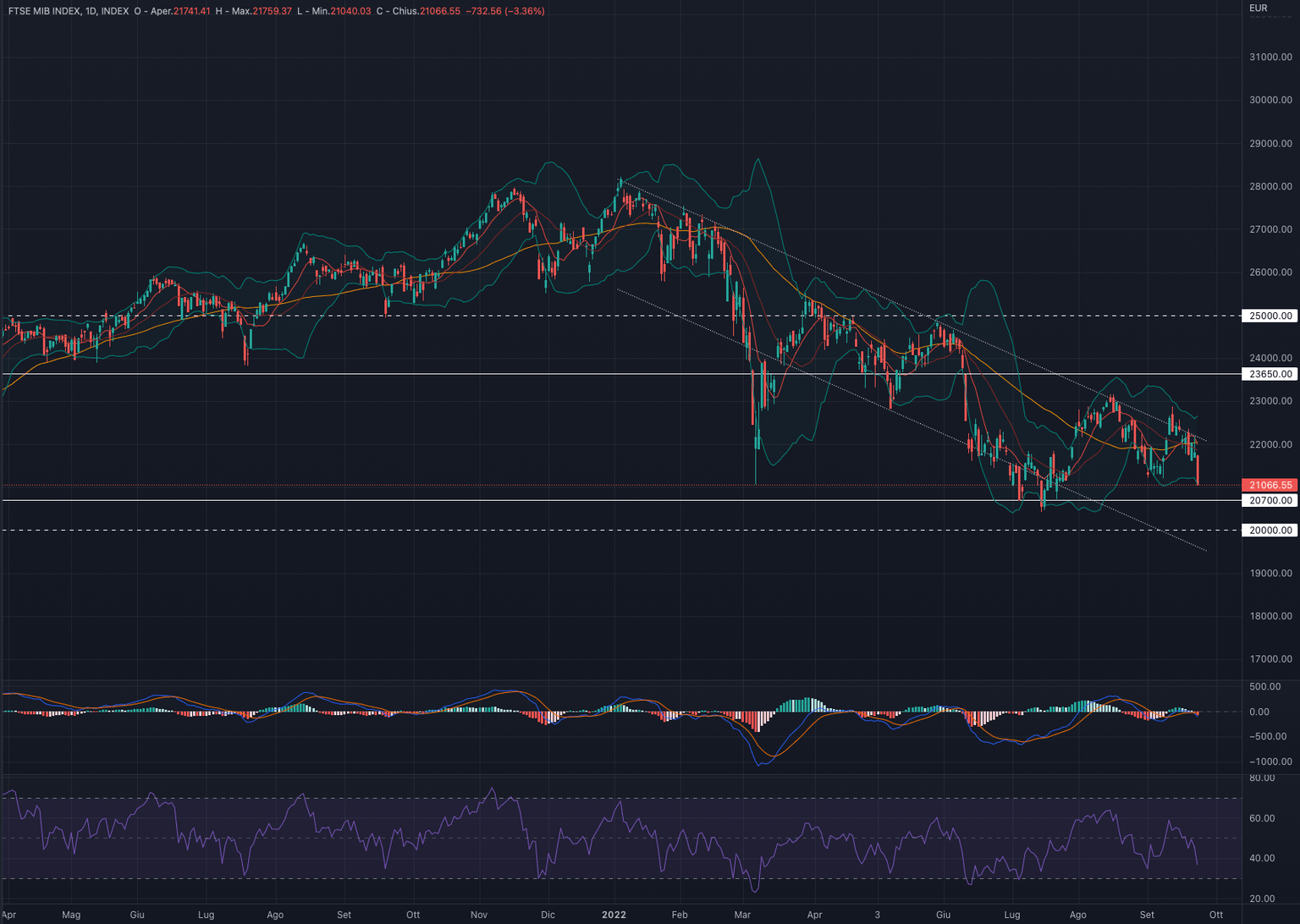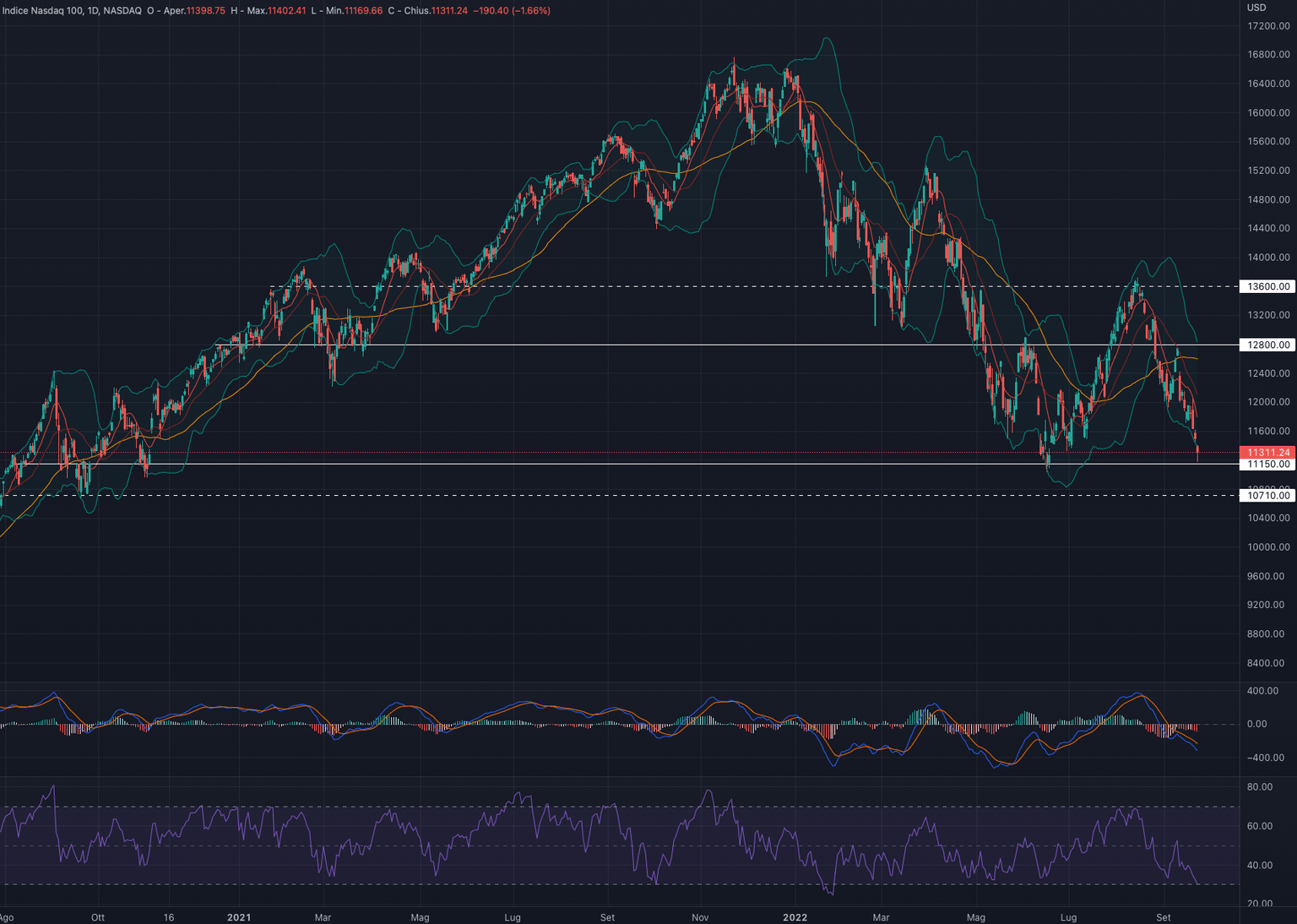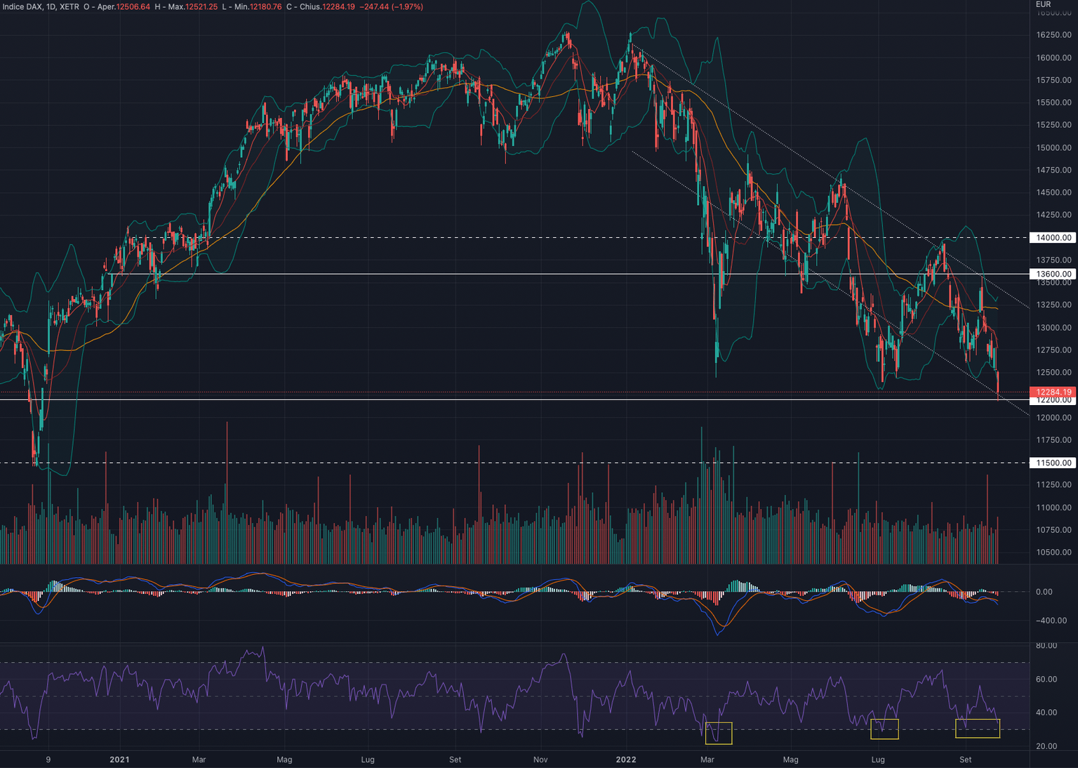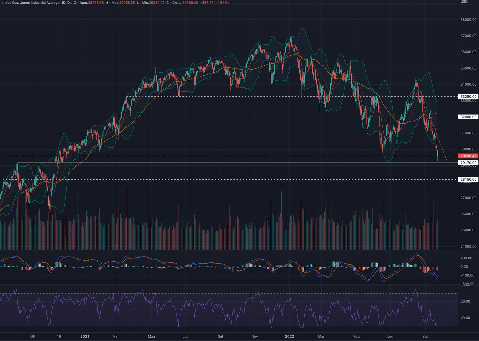 Week that brings the American index back to the lows of June 2022. After the strong Friday's selling pressure, the price is now outside the Bollinger bands and with a considerable distance from the main moving averages at 9 (red line) and 50 (yellow line ) days.