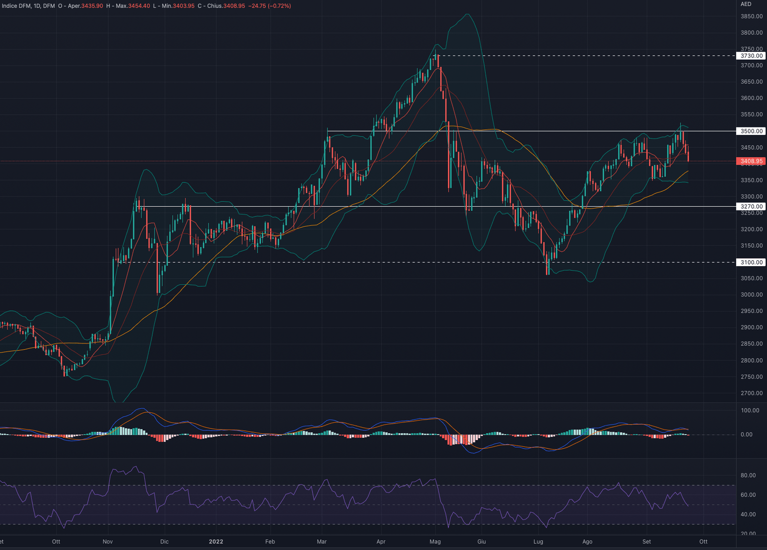 For the coming week we are in favour of a consolidation in the area of AED 3,350 - 3,400.