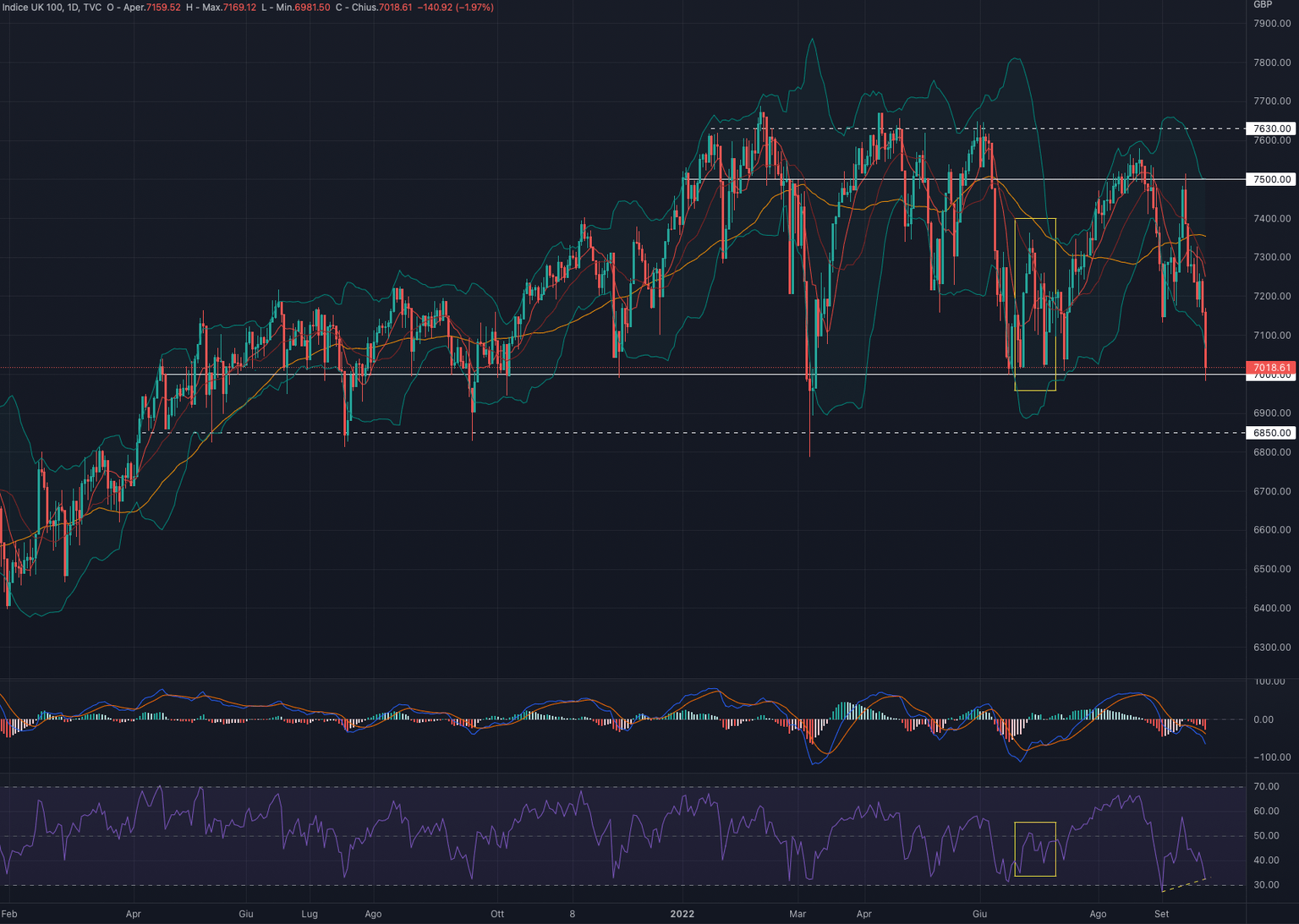 Week of significant declines for the British index which now sees the price testing again the 7,000 level.
