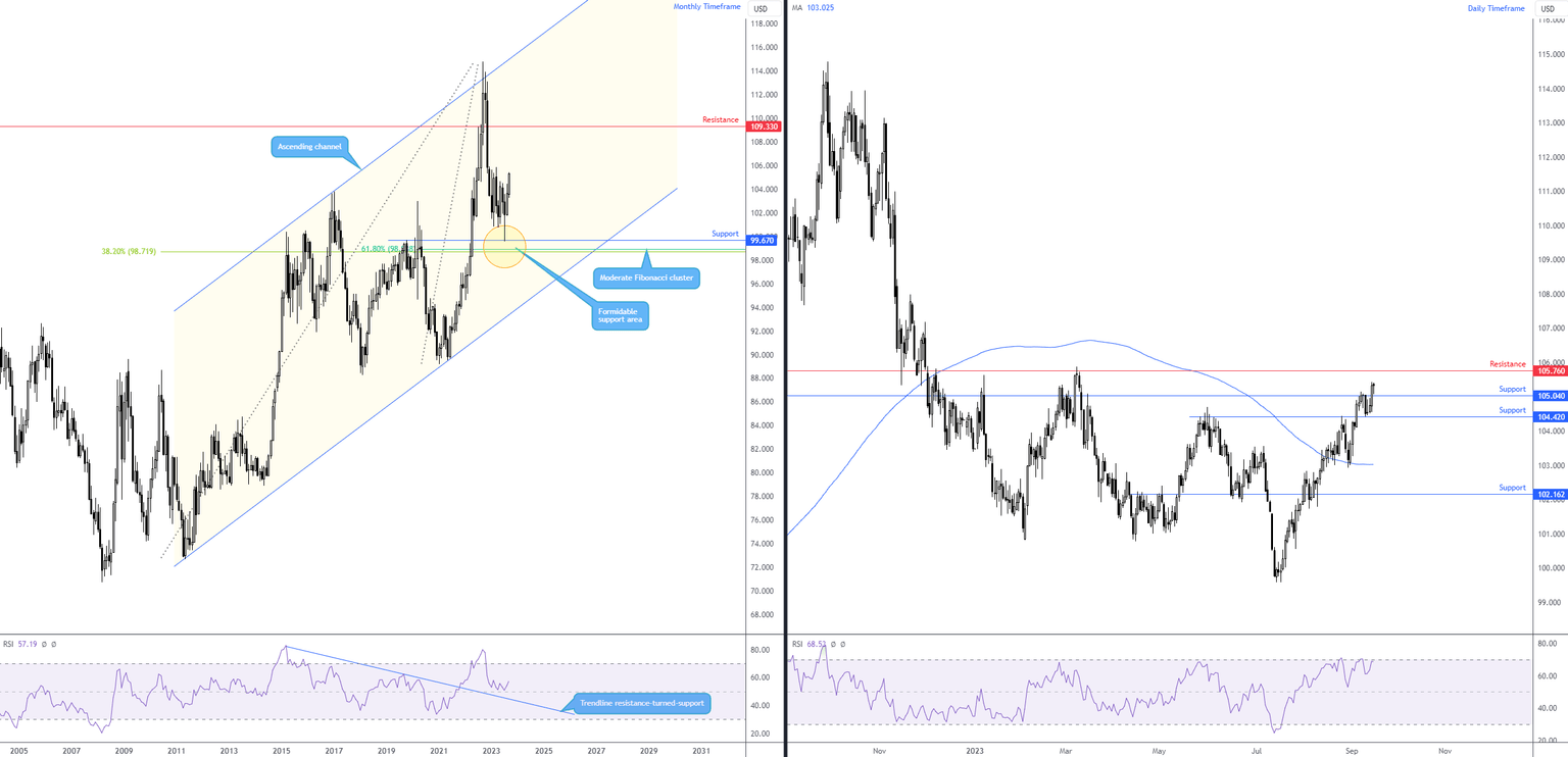 While the trend on both the monthly and daily timeframes supports higher prices this week, as does the Relative Strength Index (RSI) on the monthly timeframe (rebounding just north of the 50.00 centreline [positive momentum]), the daily timeframe’s RSI is displaying signs of negative divergence at overbought levels. Therefore, although higher levels are on the table this week, a correction to retest daily support from 105.04 (or even daily support at 104.42) is not out of the question (a move that may attract dip-buying in line with the underlying trend).