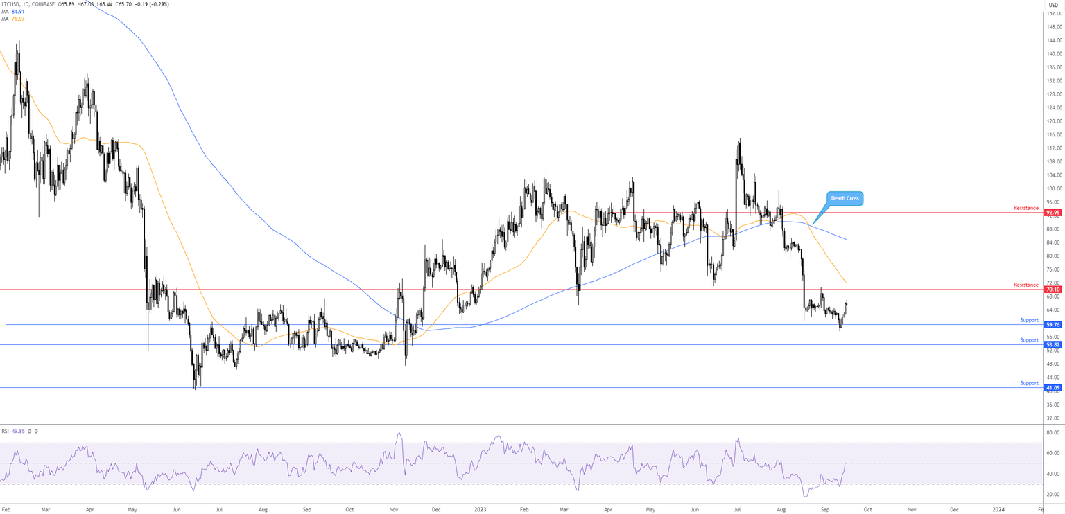 The overall trend has remained south for this major altcoin since topping at $114.98 in early July of this year. Consequently, following a series of lower lows and lower highs and a Death Cross (the 50-day simple moving average [$71.97] crossing under the 200-day simple moving average [$84.91], a move indicating a longer-term bearish trend), the rebound from daily support noted above at $59.76 could be viewed as a potential sell-on-rally opportunity.