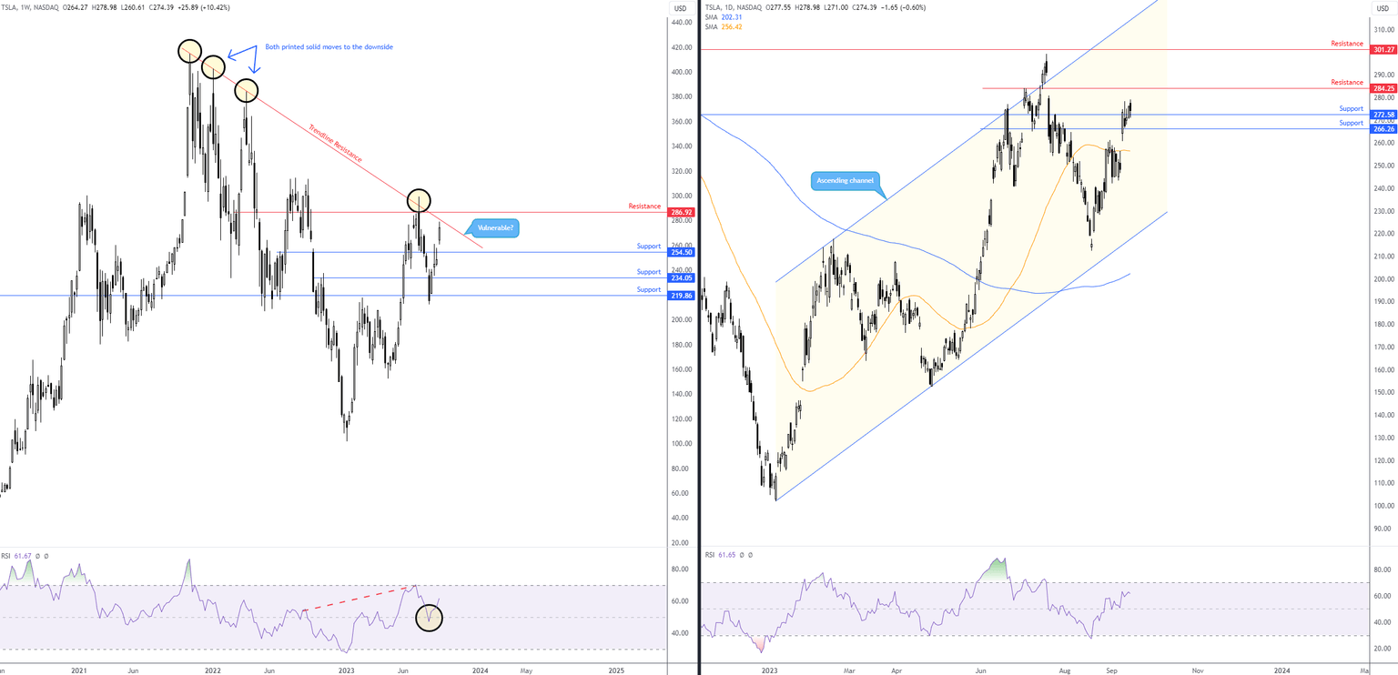 Closing higher for a fourth consecutive week after rebounding from weekly support at $219.86 (a level complemented by the Relative Strength Index [RSI] recoiling from the 50.00 centreline), Tesla (TSLA) added more than 10.0% last week.