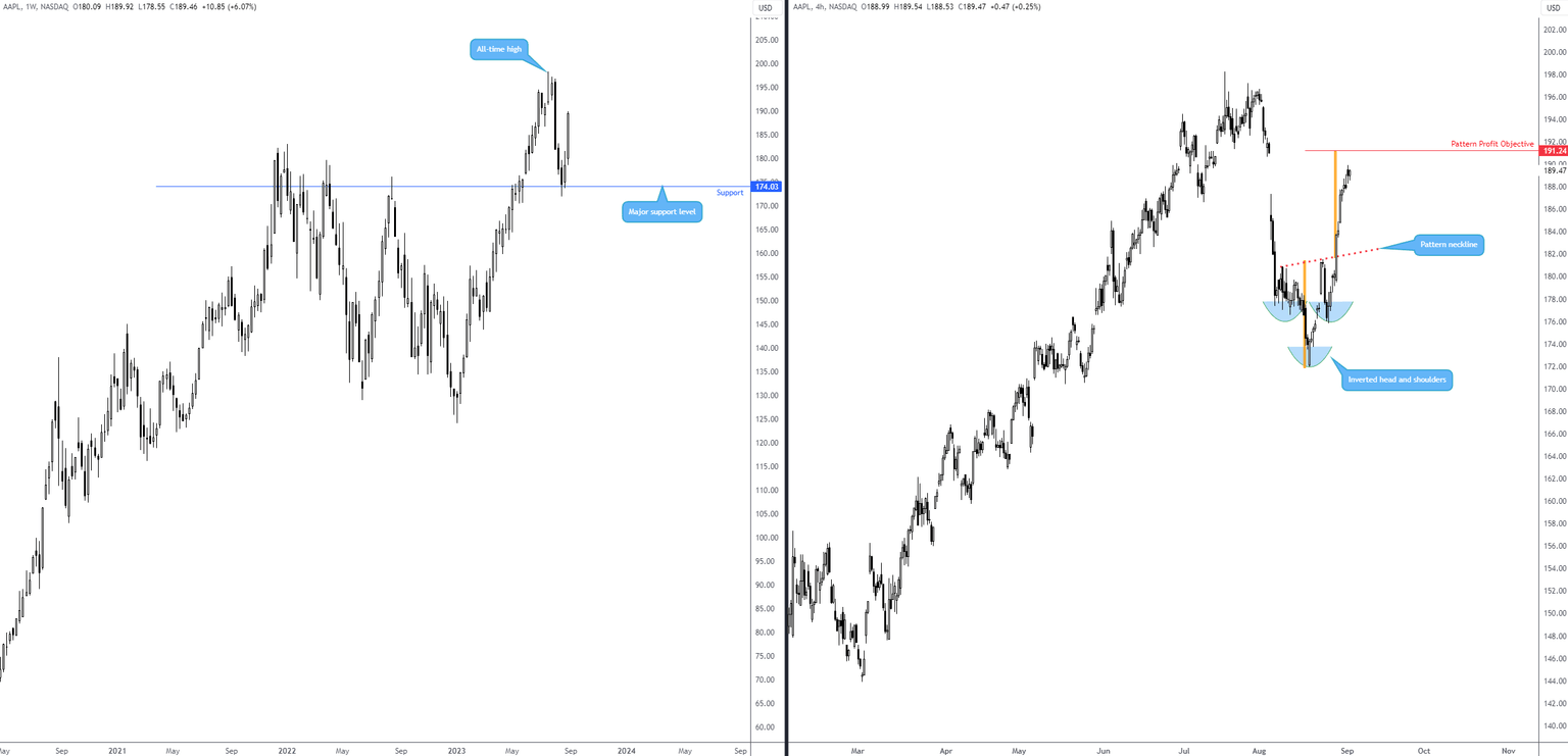 As seen from the weekly chart of AAPL, the price staged a notable rebound from key support at $174.03 in the second half of August. This move not only shone a light on the all-time high of $198.23 as a viable upside objective but it was also accompanied by a H4 inverted head and shoulders pattern ([left shoulder] $176.55 [head] $171.96 [right shoulder] $175.82).
