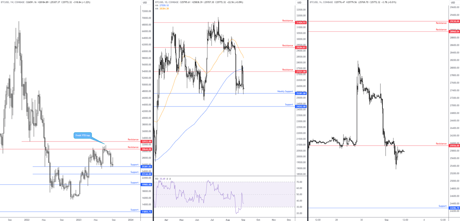 As we move to the H1 timeframe, $25,936 is a key short-term level. You will note that the level was breached in recent trading, potentially signalling a willingness to retest the mettle of weekly support at $25,381 and opening the door for short-term breakout selling opportunities. Interestingly, I also see limited support on the H1 chart until as far south as $24,286, indicating that price could tunnel through $25,381 in the following weeks.