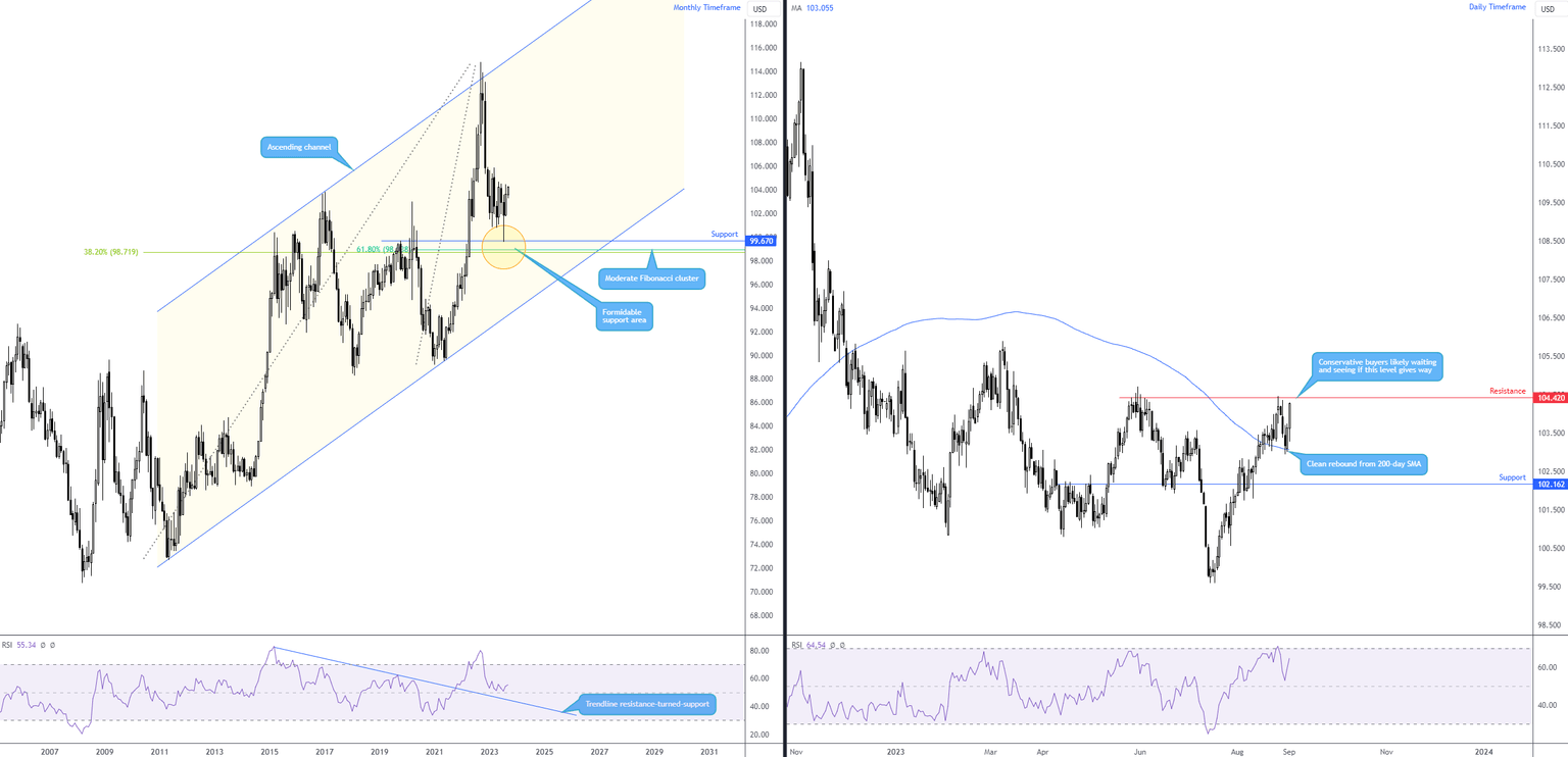 The long-term trend has been northbound since bottoming in 2008 at 70.70 if one focusses on the longer-term swings. Q4 (2022), as you can see, printed its latest correction from 114.78 (from channel resistance). Price action also recoiled from a substantial support level on the monthly timeframe at 99.67 in July (complemented by two neighbouring Fibonacci ratios [38.2% and 61.8%] at 98.72 and 98.95, respectively). This, of course, adds weight to the bullish offensive we have been seeing in recent weeks and is in harmony with the overall trend.