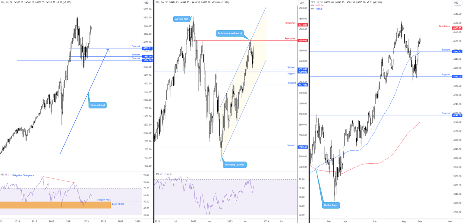 Stepping down to the weekly timeframe, the unit came within a stone’s throw of a support area between 4,300 and 4,325 that I highlighted in previous work, before staging a solid rebound in the second half of August. Resistance at 4,595 will likely be on the radar for many traders and investors this week, considering the ceiling it delivered at the end of July. Though having seen limited resistance on the monthly chart, a breakout north of 4,595 could be on the table in the coming weeks, a move unearthing another weekly resistance at 4,743, sheltered just under the all-time high noted above.