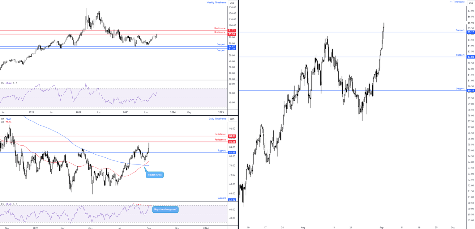 Elsewhere, on the daily timeframe, Friday closed out the week +2.9% higher and recorded a fourth consecutive daily gain. Underpinning the possibility of further strength in this market on this timeframe is the formation of a Golden Cross, which occurred in late August (the 50-day simple moving average [$77.86] crossing above the 200-day simple moving average [$76.01] and is generally observed as a signal that the market could be headed for a longer-term uptrend). On the flip side of this, however, the daily chart’s RSI reveals the possibility of negative divergence (essentially informing traders and investors that upside momentum might be slowing and thus giving rise to a pause or even a reversal). Regarding technical structure to keep an eye on this week, resistance calls for attention nearby at $86.36, sheltered by another neighbouring layer of resistance coming in at $88.80, while support demands consideration at $81.69. Evidently, the combination of weekly resistance at $85.20, daily resistance from $86.36 and daily RSI negative divergence may prove troublesome for bulls this week.