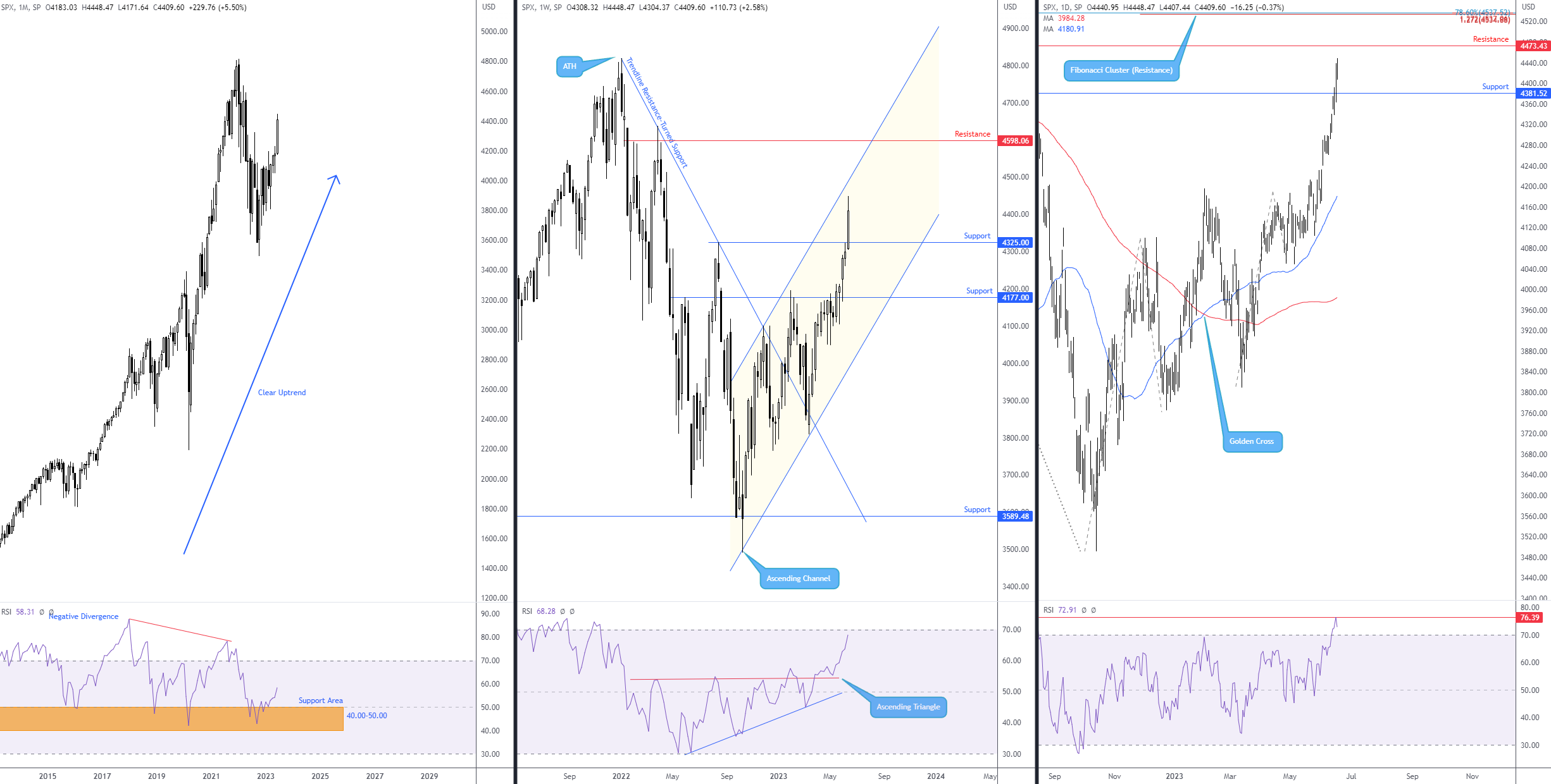 Aided by the Relative Strength Index (RSI) rebounding from support between 40.00 and 50.00 (common in strong uptrends), monthly price is fast approaching the all-time high at 4,818 set at the beginning of 2022.