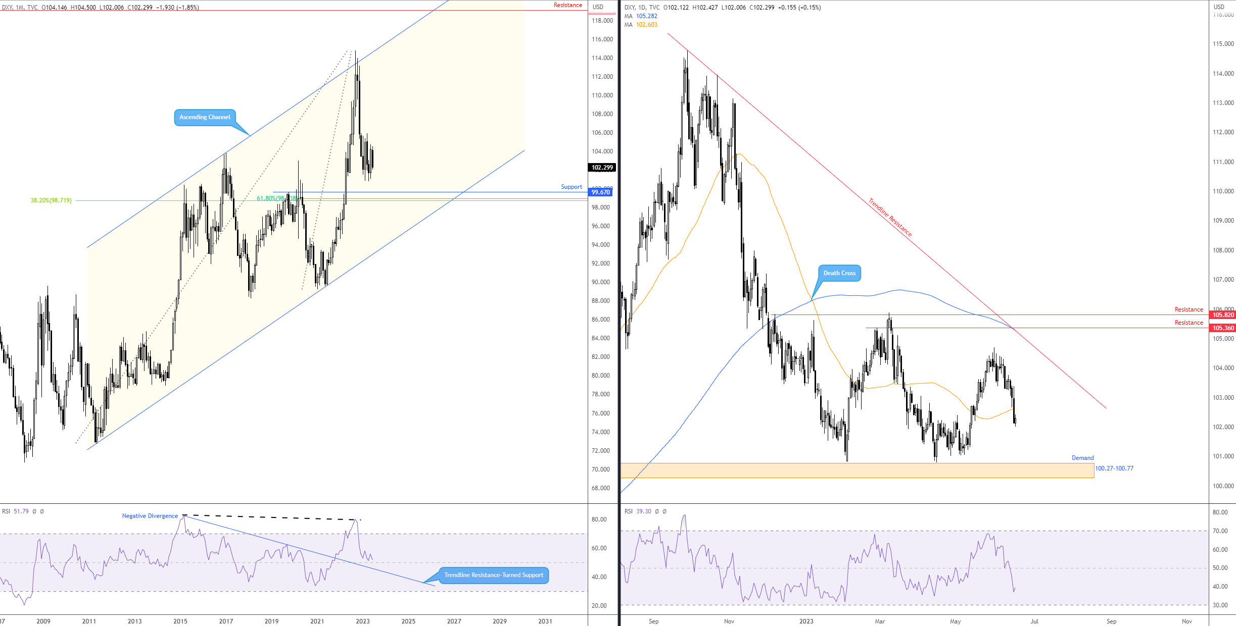 We have an interesting clash of timeframes regarding trend direction for the US dollar. The monthly timeframe has been climbing since early 2008. The current correction that begun in Q4 of 2022 has dropped around -12% (thus far), a touch shy of the previous correction seen in 2017 of around -15%. Extending the current correction could land monthly price at support from 99.67, a level complemented by two Fibonacci ratios (38.2% and 61.8%) at 98.72 and 98.95, respectively. Therefore, this is an area that may offer a floor to work with in the weeks to come, assuming further downside occurs. The daily timeframe, on the other hand, is trending southbound, both in the longer term (from the peak of 114.78) and in the short term from the peak of 104.70. With room to press lower on the monthly scale to support from 99.67 and the daily timeframe trending lower, additional underperformance is likely for the greenback.