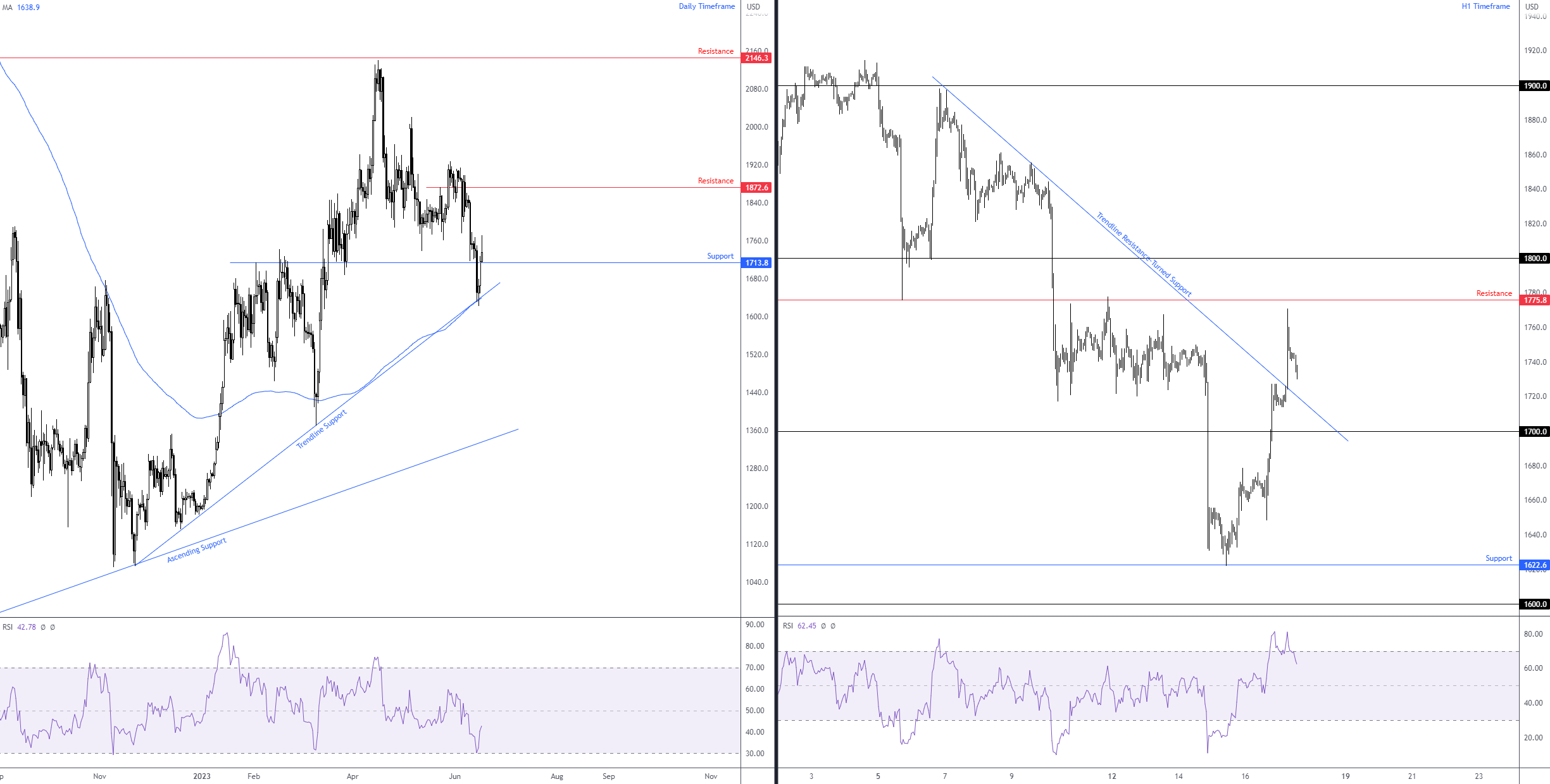 From a shorter-term perspective, price tested support at $1,622 on Thursday and eventually made its way above $1,700. Interestingly, I see that trendline resistance (taken from the high of $1,897) was taken out in recent trading, somewhat corroborating upside forecasts on the daily timeframe and revealing nearby resistance on the H1 at $1,775. I do, however, see some mild negative divergence forming out of the RSI within overbought space.