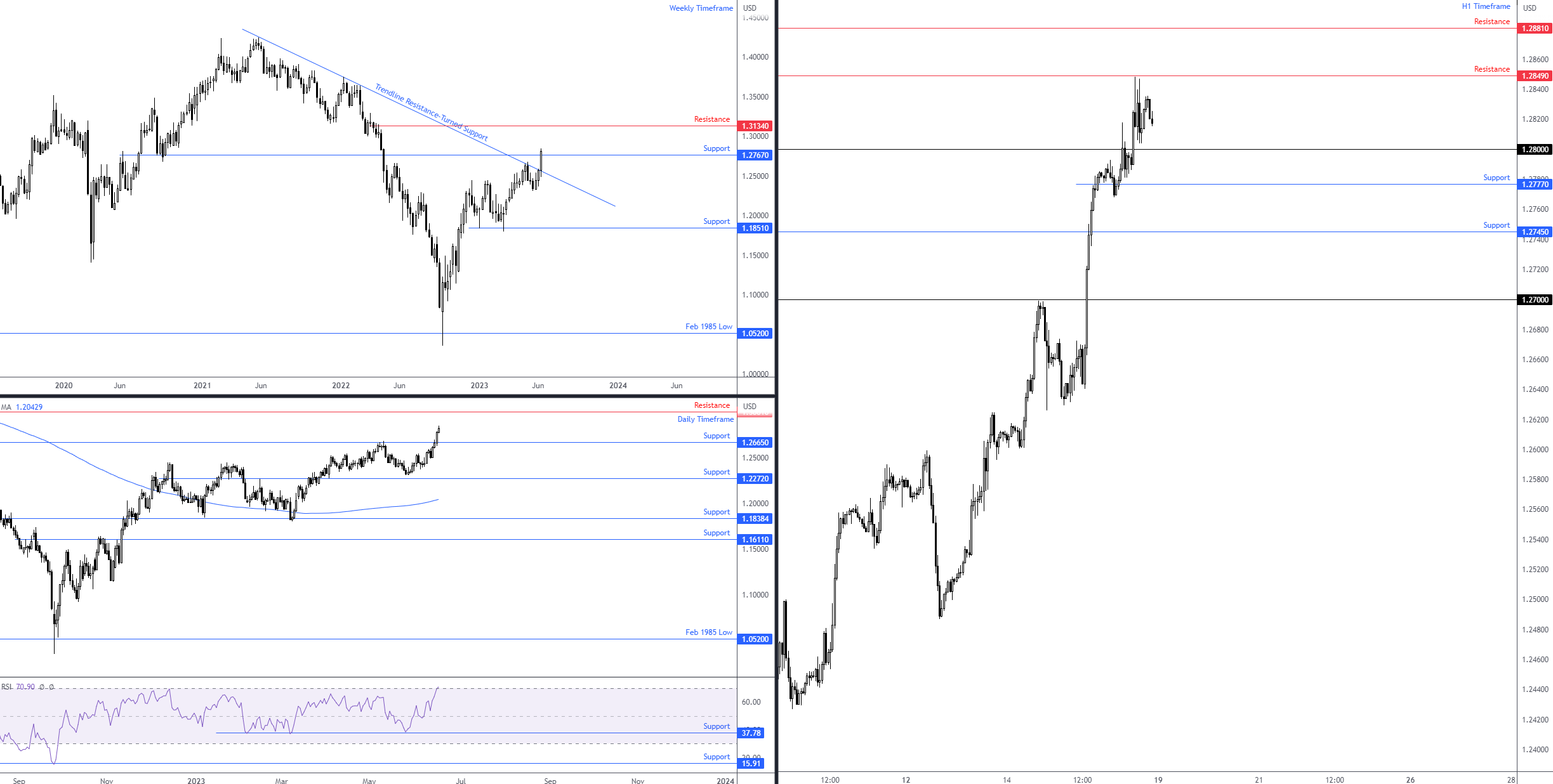 Across the page, H1 price movement—also notably trending north—ended the week above $1.28 after trading within a stone’s throw of resistance at $1.2849. Additional levels of interest this week are support at $1.2777 and at $1.2745, along with resistance calling for attention around $1.2881.
