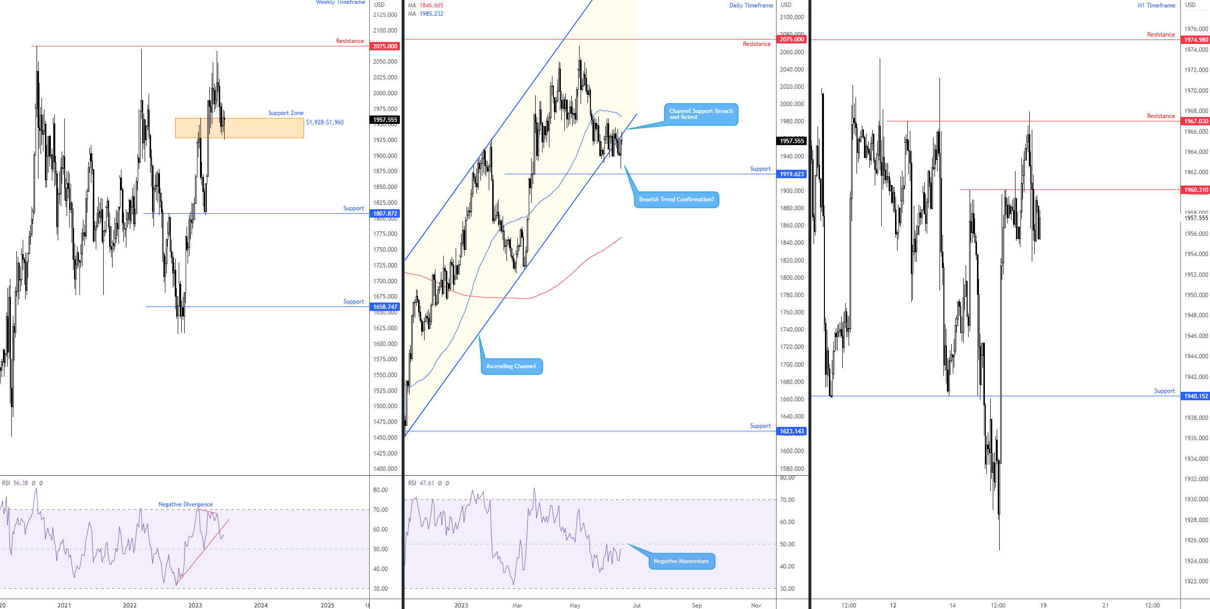 As a result of the above—weekly support echoing a vulnerable tone at $1,928-$1,960, along with daily price retesting the underside of channel support as well as H1 price perhaps gearing up to form a lower low—downside could gain speed this week, targeting H1 support from $1,940 as an initial support target.
