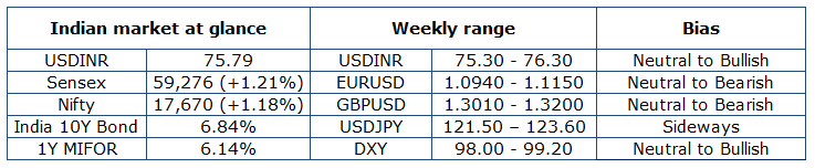 - The USDINR pair started the week with an upside bias at 76.37 levels. The pair remained volatile during the week and eventually closed the week at 75.79 levels.