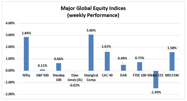 - The Indian equity index Nifty 50 showed an upward trend this week as it rose from 17,222 to 17670. As per the weekly trajectory, the energy and commodity indices have been in the red zone along with FMCG and pharma taking a bit of a downside hit. The banking and financial service sectors have been slowly showing upward trends while the IT sector has remained volatile in between the week. The FII outflow in the month has been substantial, however, the domestic investors have kept the balance up keeping the market stable and slowly keeping an upside trend. The volatility is expected to remain for some time due to global and domestic cues that are currently driving the market.