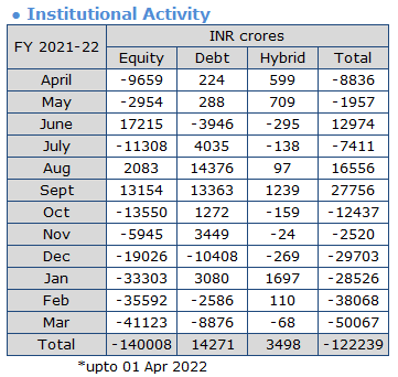 - The USDINR pair rose after Fed Chair Powell stated that inflation is much too high and to reign it in, the central bank may raise interest rates by a bigger quantum if required. Prices of Brent crude oil also remained elevated and were above $110 a barrel during the month due to existing tension between Russia and Ukraine. However, Crude oil prices fell after Shanghai, China's financial hub, imposed a lockdown to curb a surge in COVID-19 cases, which led to renewed fears of demand destruction. The peace talk between Russia and Ukraine calmed the Risk aversion, leading to a weakening of the dollar index. The Asian and domestic equity markets too looked optimistic as the market continued to rally.