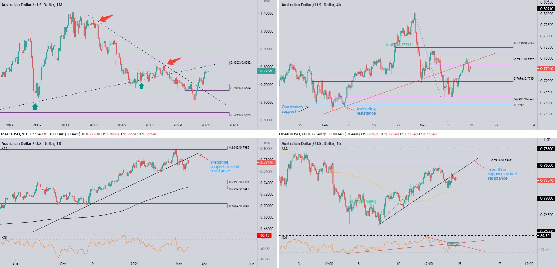 Buyers and sellers went head-to-head at supply from 0.7811/0.7770 in the latter part of the week, an area sharing chart space with ascending resistance, drawn from the low 0.7563.