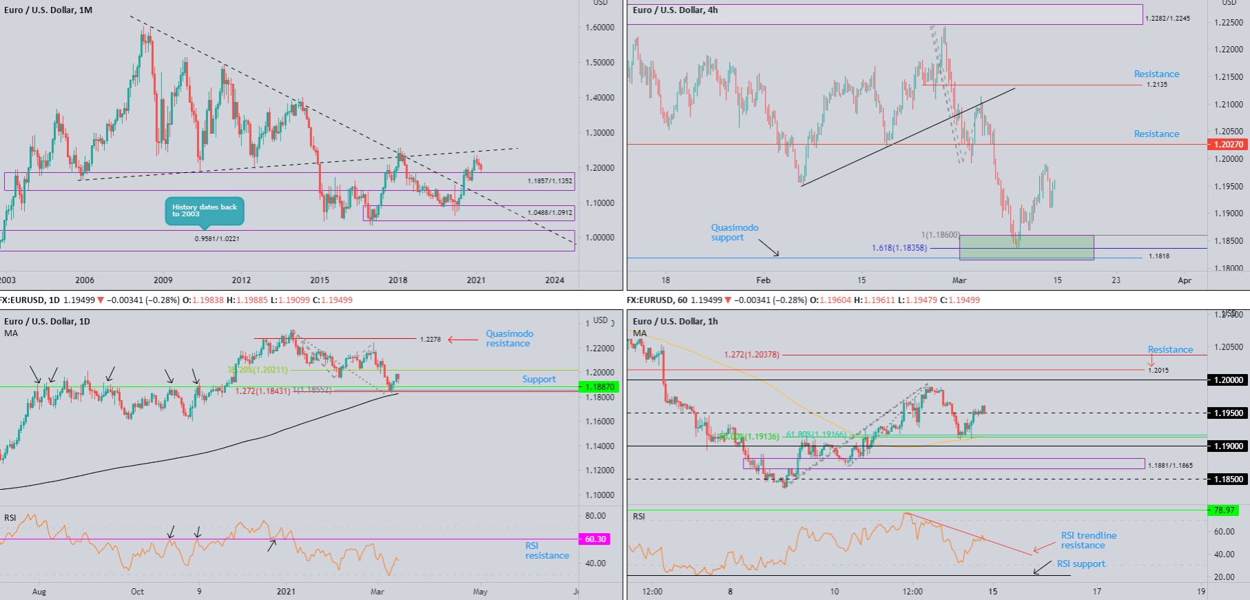 Knowing monthly price is shaking hands with demand and daily price exhibits scope to extend recovery gains to around 1.2021, H4, after rebounding from support between 1.1818 and 1.1860 (Quasimodo support at 1.1818, 161.8% Fib projection at 1.1835 and a 100% extension at 1.1860), could make its way to resistance at 1.2027 this week.