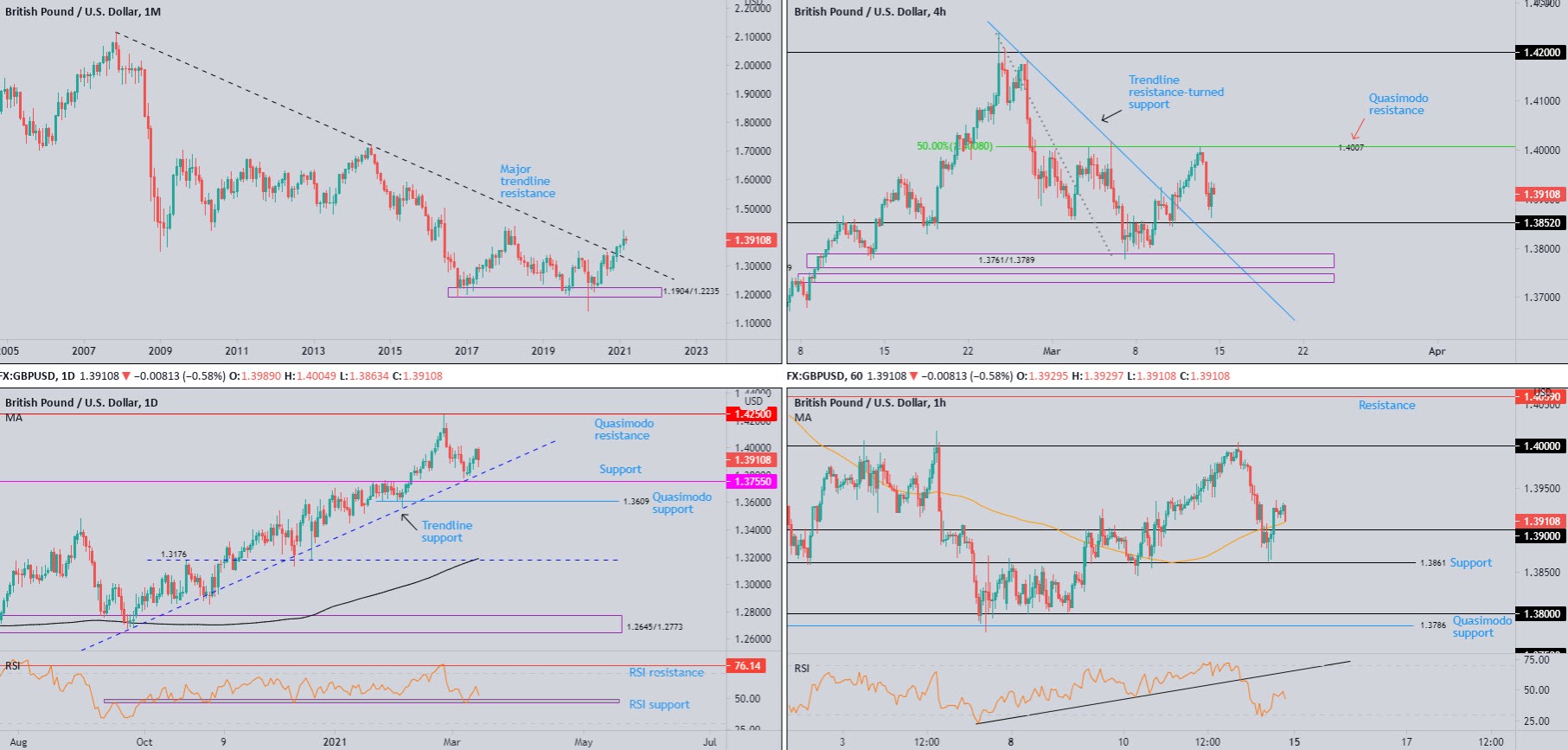 Quasimodo resistance drawn from 1.4250 is also worth a shout, should buyers enter the scene, while territory beneath 1.3755 places Quasimodo support at 1.3609 in the line of fire.