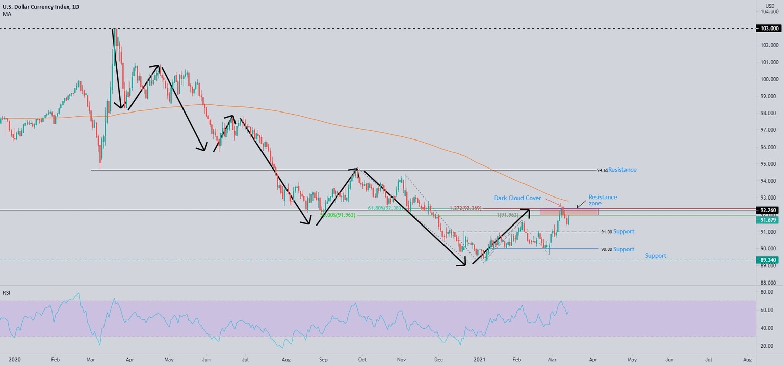 As aired in recent weekly writing, the index topped south of the 103.00 figure in March 2020 and launched a series of lower lows and lower highs (a clear-cut downtrend—price swings: see black arrows)
