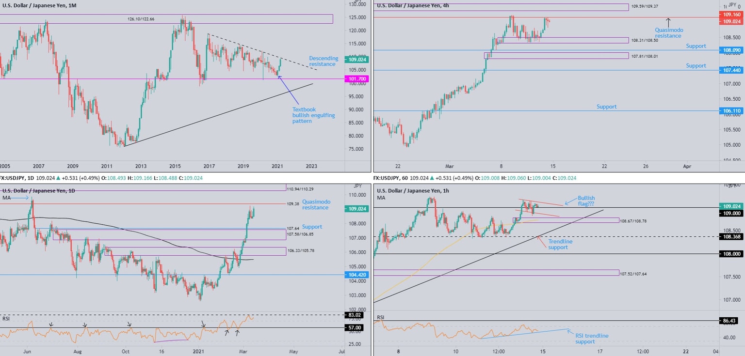 While the immediate trend has faced north since the beginning of the year, and the H1 is in the process of chalking up a bullish flag, H4 Quasimodo resistance at 109.16 and H4 supply from 109.59/109.37 (together with merging daily Quasimodo resistance at 109.38 and the monthly descending resistance) could be problematic.