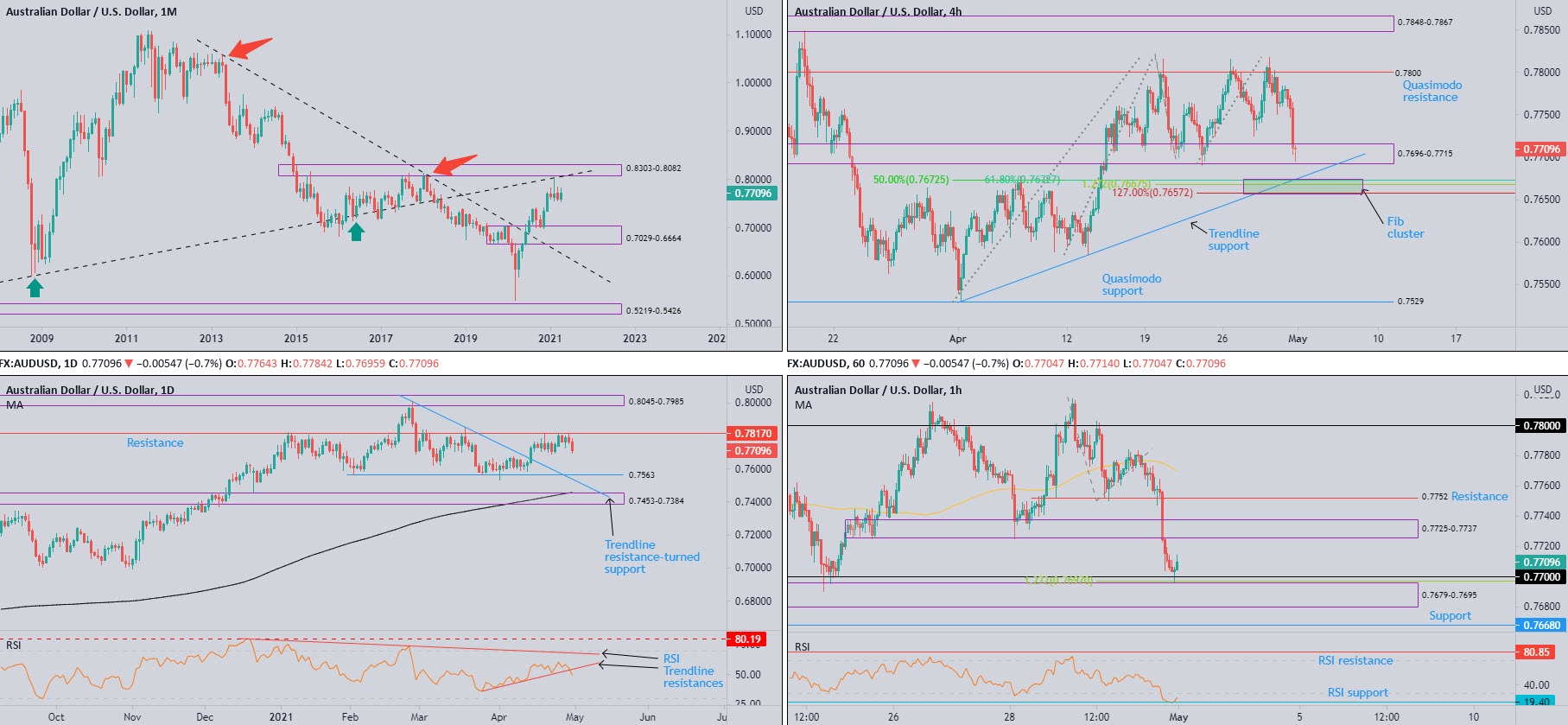Alternatively, elbowing through 0.77 and neighbouring H1 demand at 0.7679-0.7695 to test H1 support at 0.7668 (conveniently housed within the H4 Fib cluster at 0.7657-0.7672) could also attract bullish focus.