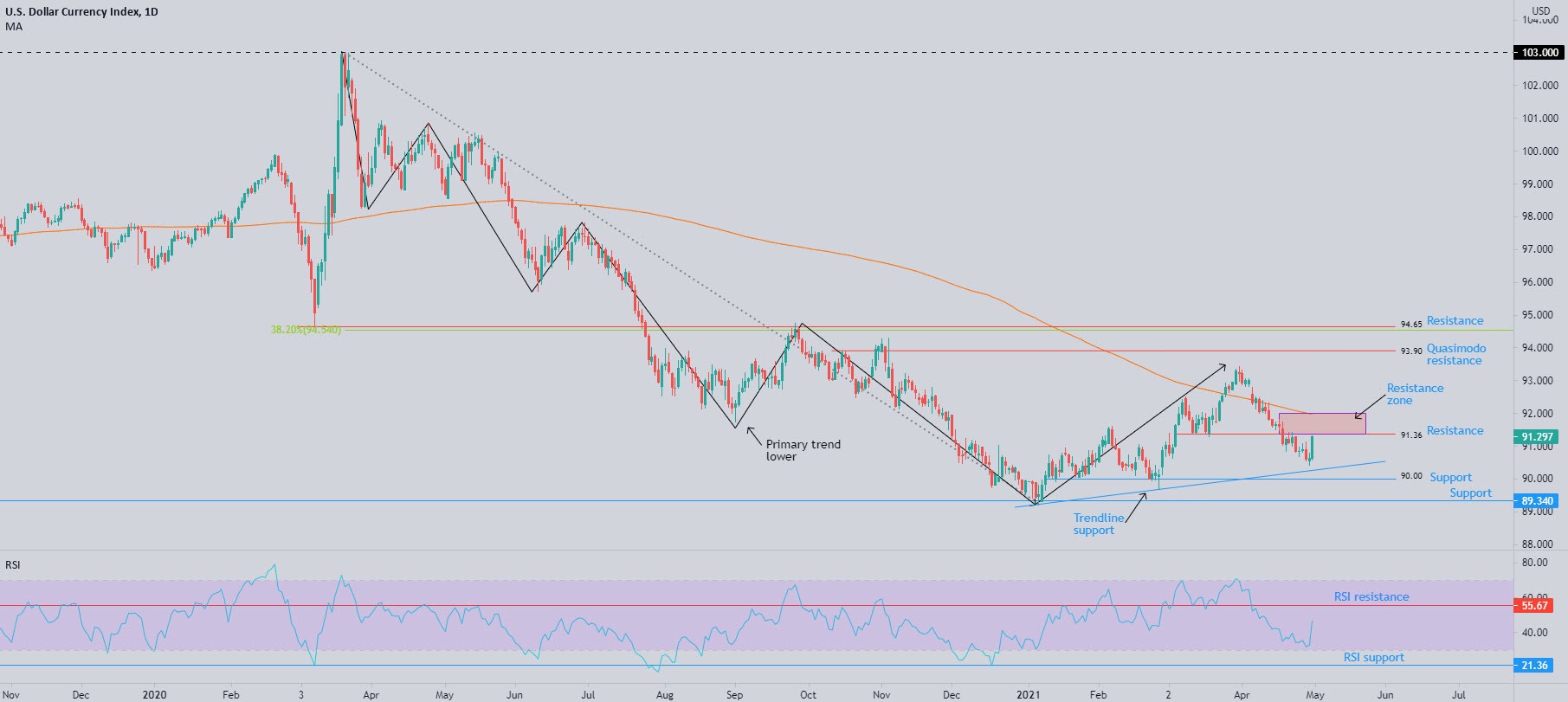 Long-term trend studies show the USD has been underwater since topping ahead of 103.00 in March 2020—many analysts likely refer to this downward movement as a primary trend on the daily scale. Also worth highlighting is the 93.43 31st March peak, and subsequent slide in April, which echoes seller strength within the downtrend.