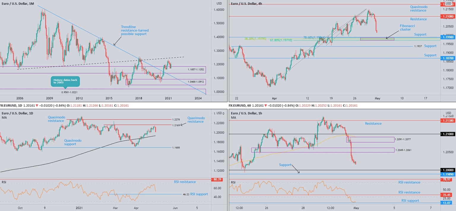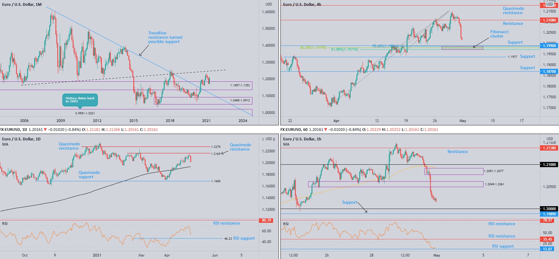 While the round number is likely a watched base in this market, traders are urged to pencil in the possibility of a whipsaw through the level. Orders are likely to crowd this area, welcoming movement known as a stop run. Bids, assuming heavyweight orders, from both H1 support at 1.1989 (prior Quasimodo resistance) and H4 support between 1.1971 and 1.1990, therefore may welcome the stops (sell orders) beneath 1.20.