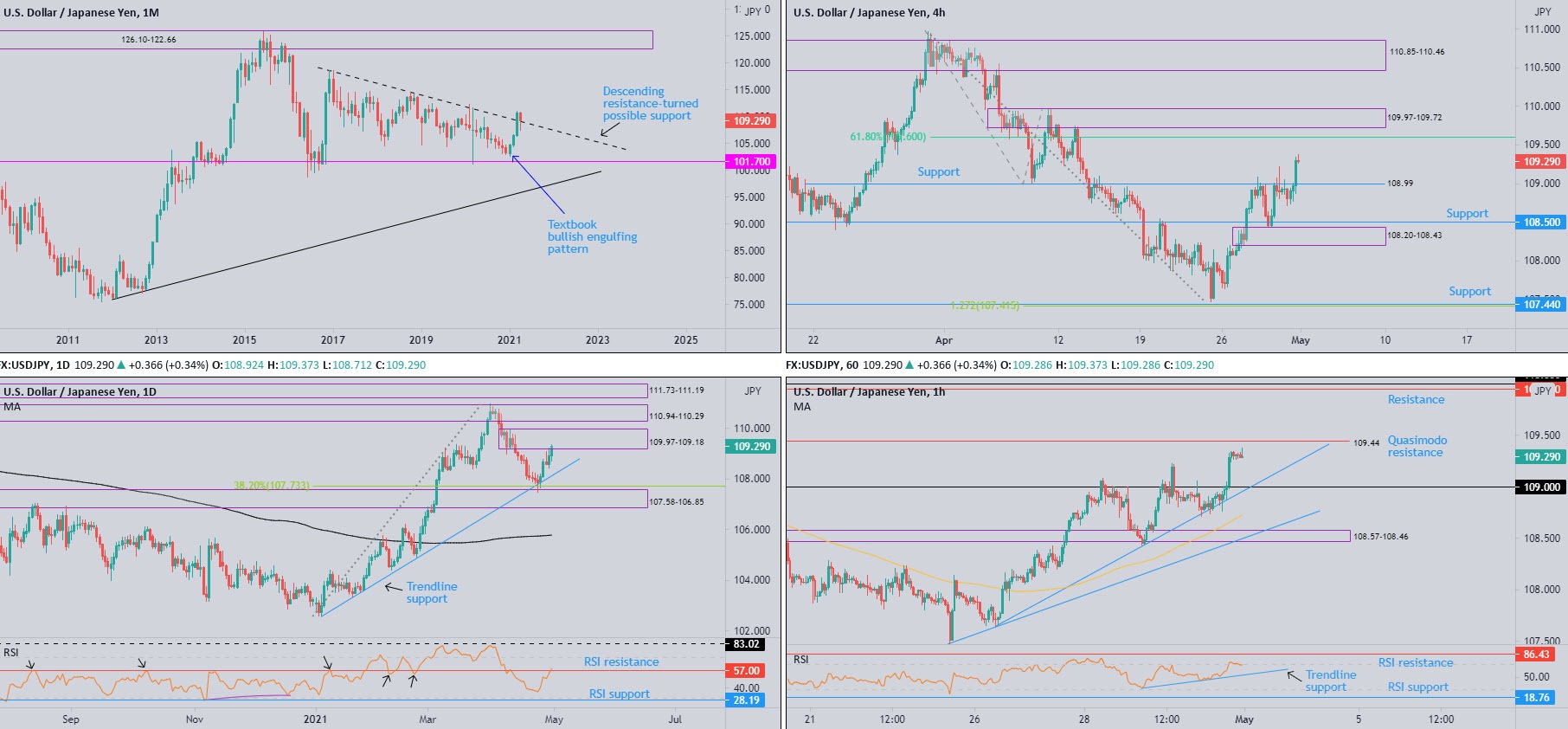 H1 Quasimodo resistance at 109.44, although the base could trigger mild bearish interest, is likely to surrender, according to chart studies. Not only do we have monthly price showing signs of supportive structure, the H4 scale displays scope to advance at least to the 61.8% Fib level at 109.60 and nearby supply at 109.97-109.72.