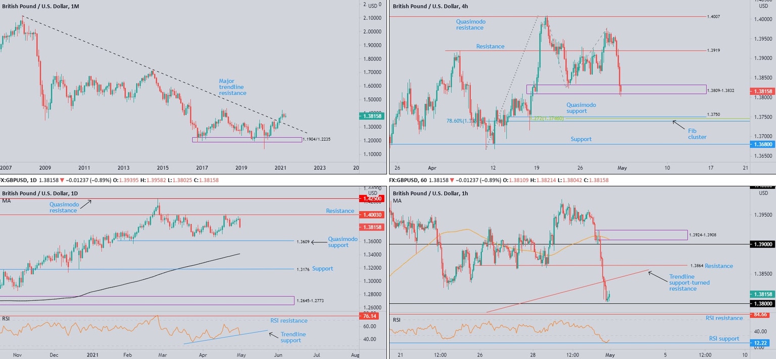 Friday’s single-sided decline plummeted into 1.3809-1.3832 demand and clipped the lower side of the base. This brings notice to Quasimodo support at 1.3750, which happens to align with a 1.272% Fib projection at 1.3746 and a 78.6% Fib level at 1.3739 (Fib cluster).