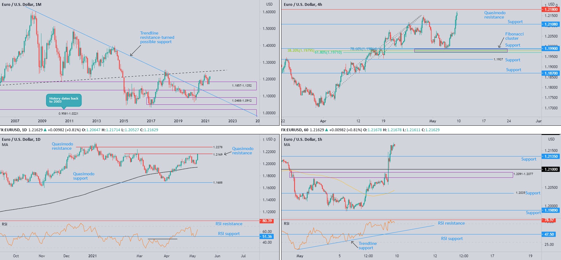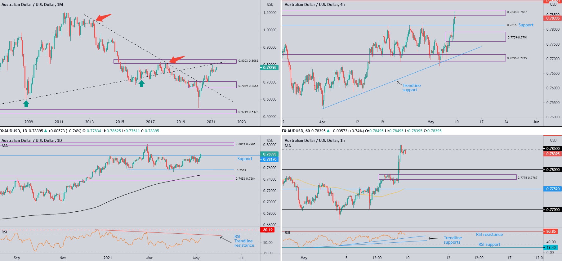 Since the beginning of 2021, buyers and sellers have been battling for position south of trendline resistance (prior support - 0.4776 high) and supply from 0.8303-0.8082. However, with May trading 1.7 percent in positive territory, visiting the aforesaid areas could be on the table.