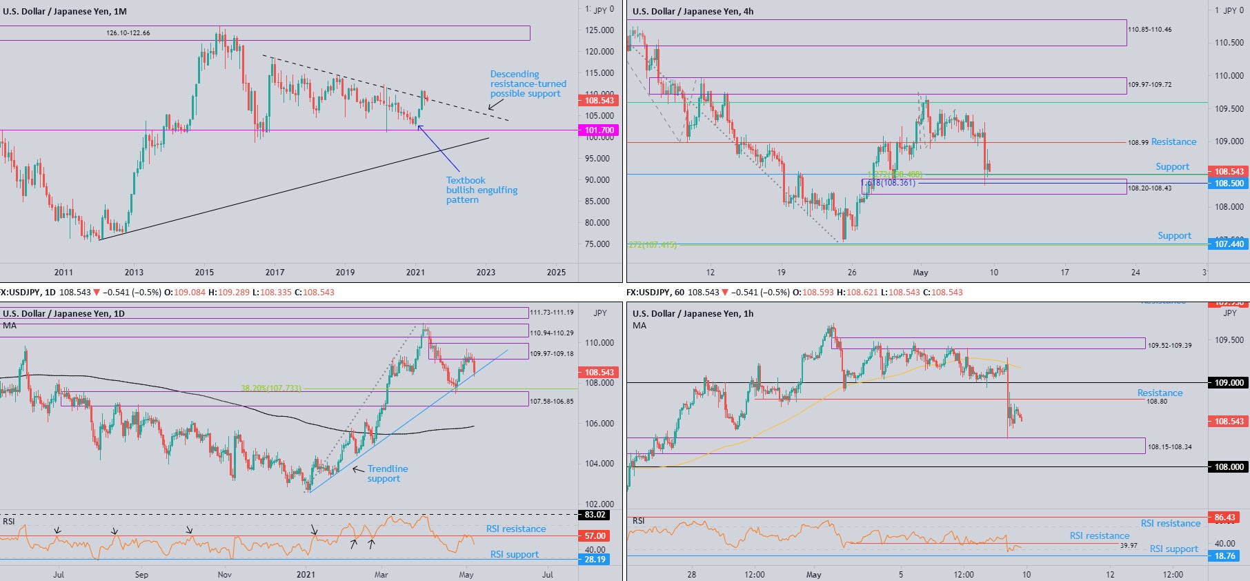 The spirited decline had price action bump heads with a support area at 108.15-108.34 (glued to the underside of H4 demand at 108.20-108.43), extended from early March 2020, and subsequently retest the lower side of the breached Quasimodo support as resistance. Below 108.15-108.34, traders are likely to have the 108 figure pinned on the board.