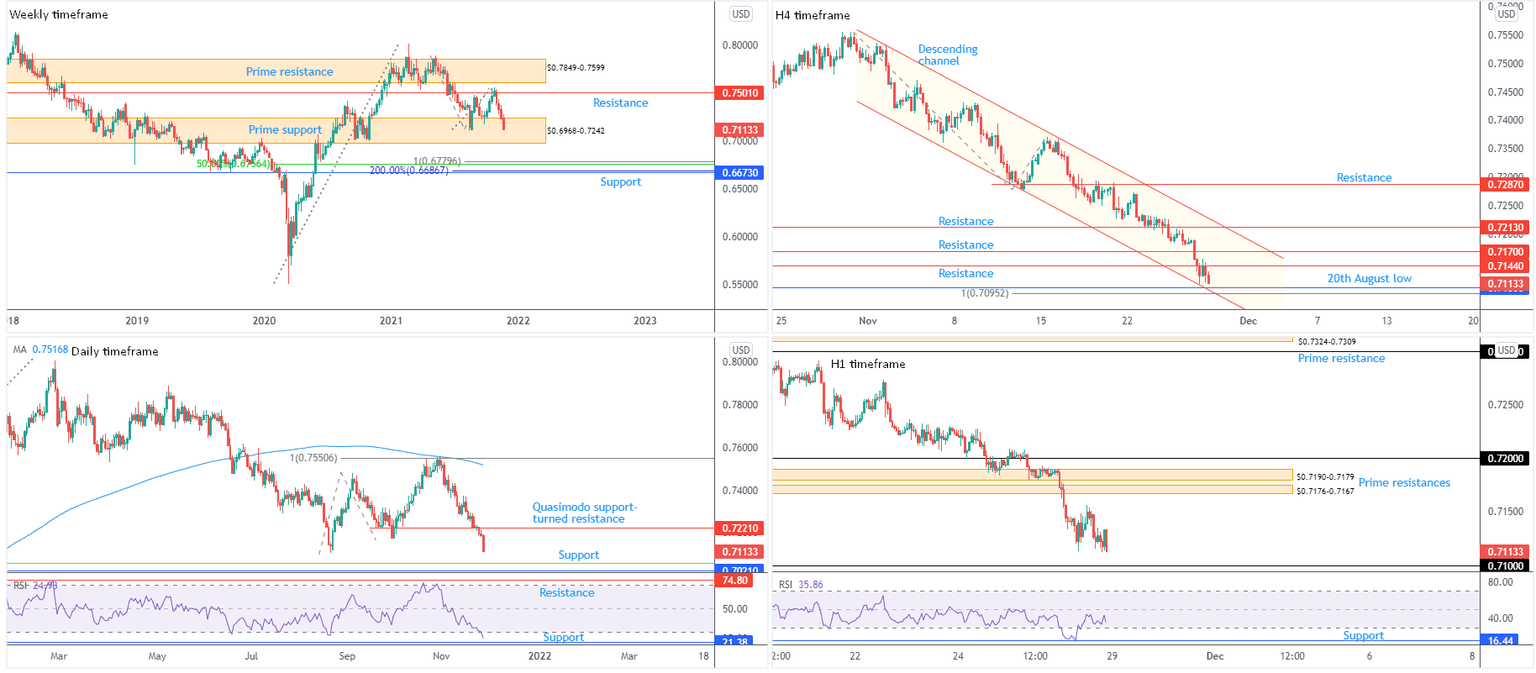 $0.71 is key on the H1. This, as well as H4 support ($0.7106, a 100% Fibonacci projection at $0.7095 and channel support), echoes a short-term floor early week. Though any upside efforts are likely to be greeted by sellers at H1 prime resistances ($0.7190-0.7179 and $0.7176-0.7167), as traders look for sell-on-rally scenarios as a result of the immediate downtrend.