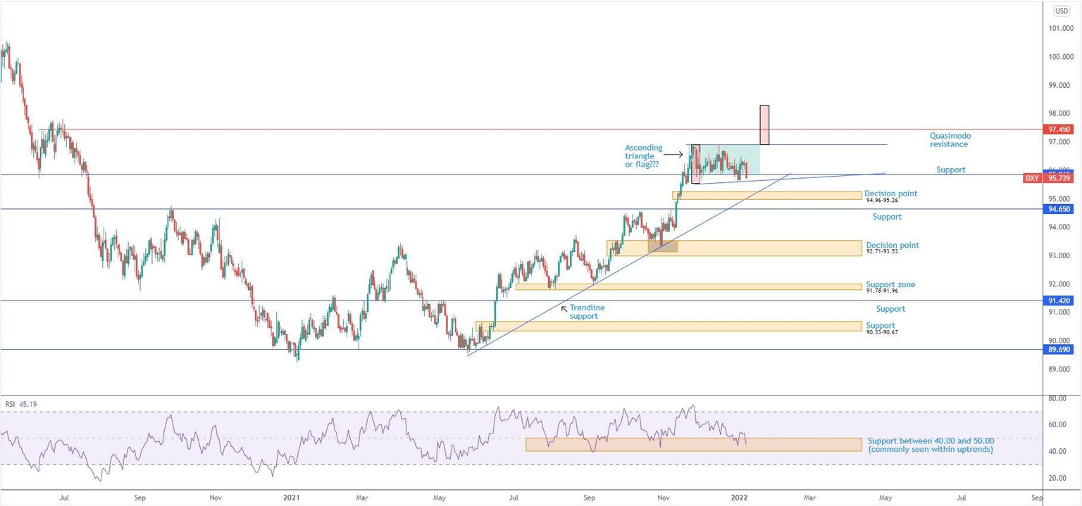 Support at 95.86—boasting strong historical significance—served immediate flow well since mid-November 2021. What’s also technically pertinent is current price action forming either an ascending triangle or flag pattern on top of support, both of which echo a bullish ‘flavour’. A breakout to the upside has Quasimodo resistance to target at 97.45, followed by the ascending triangle’s profit objective at 98.29 (red boxes). Alternatively, 95.86 support giving way unchains the door to a decision point from 94.96-95.26 and a trendline support, extended from the low 89.84.