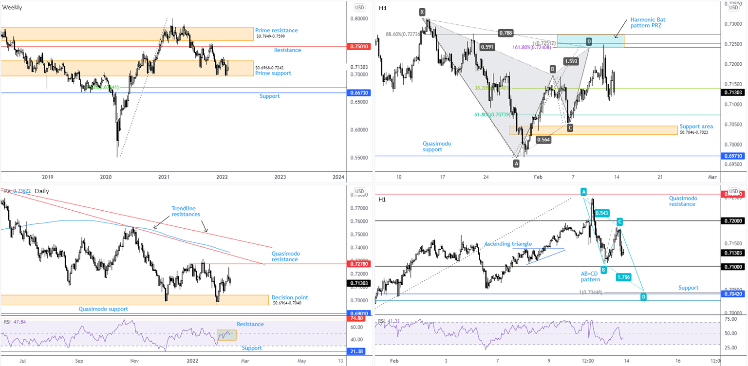 From the H1 chart, Friday established a top ahead of $0.72 during US hours and is poised to reconnect with $0.71. Interestingly, slicing under the latter unlocks support at $0.7042 which aligns with a 100% Fibonacci projection at $0.7045 (AB=CD structure), and a neighbouring 78.6% Fibonacci retracement at $0.7027 (blue line).