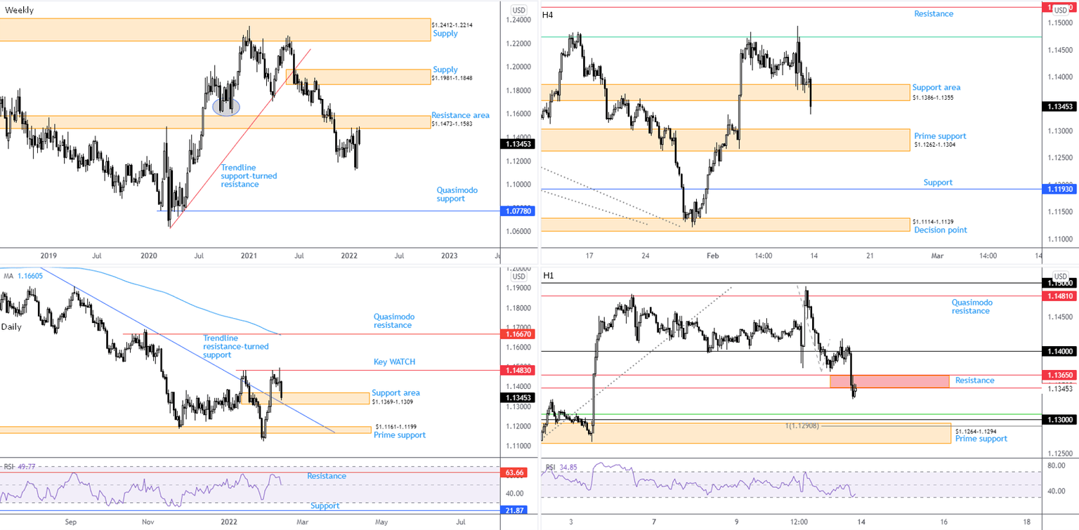Across the page on the H4 timeframe, last week run into the 61.8% Fibonacci retracement at $1.1475 (green)—provided a technical ceiling since mid-January and is plotted south of resistance at $1.1530. Subsequent movement witnessed Friday slip below support from $1.1386-1.1355, action perhaps clearing the technical runway to prime support at $1.1262-1.1304.