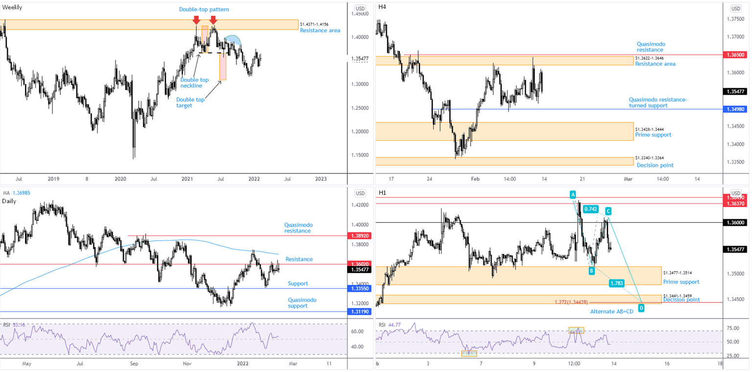 From the H1 timeframe, Friday retested the underside of $1.36 and unshackled the possibility of bringing in prime support at $1.3477-1.3514 (surrounds H4 Quasimodo support-turned resistance at $1.3498). However, as this prime zone has been tested, it could be fragile. Consequently, this throws the decision point at $1.3441-1.3459 in the mix, along with an ‘alternate’ AB=CD formation at $1.3444 (a 1.272% Fibonacci projection). What’s technically interesting is the H1 decision point shares space with the H4 prime support mentioned above at $1.3428-1.3444.