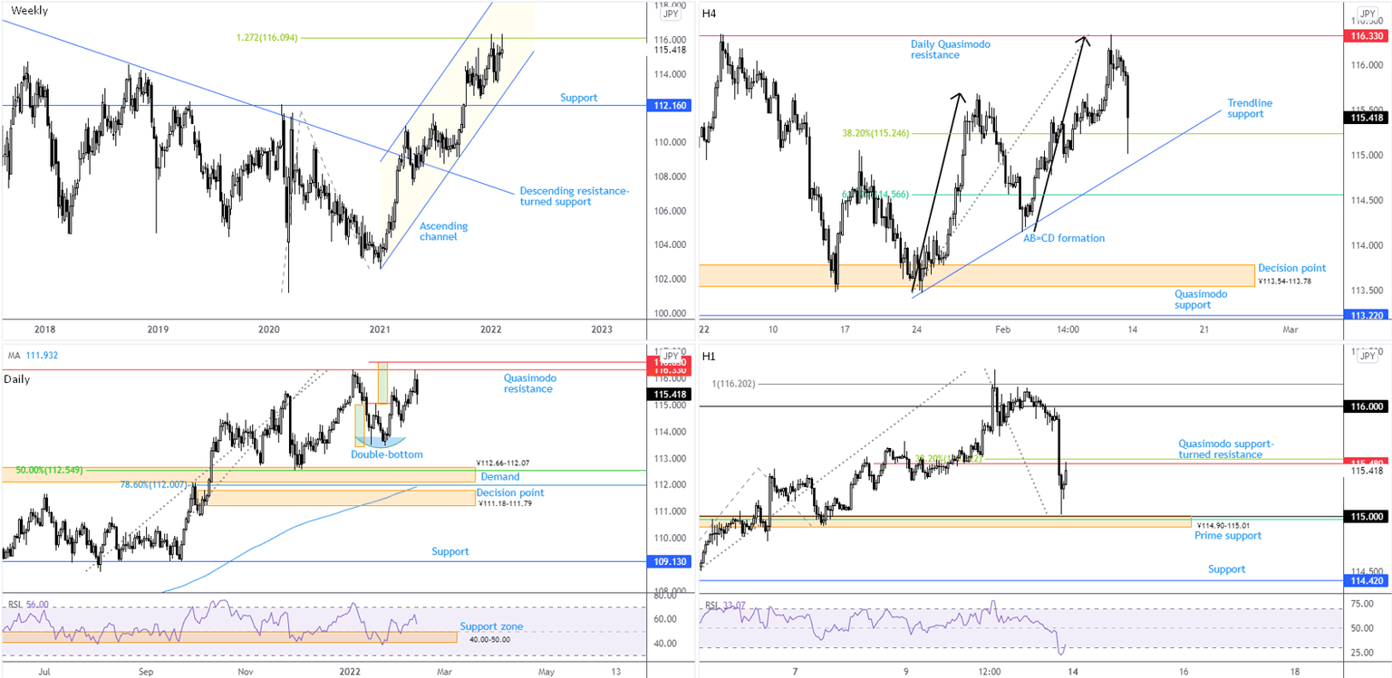 Lower down on the H1 timeframe, following an earlier retest of ¥116, Friday spiked to within a pip of ¥115 and prime support at ¥114.90-115.01 (houses a 61.8% Fibonacci retracement at ¥114.98 [green line]) and settled at Quasimodo support-turned resistance from ¥115.48 (located under a 38.2% Fibonacci retracement at ¥115.52). Below prime support exposes support at ¥114.20. Friday’s abrupt selling also forced the H1 RSI to record oversold conditions.