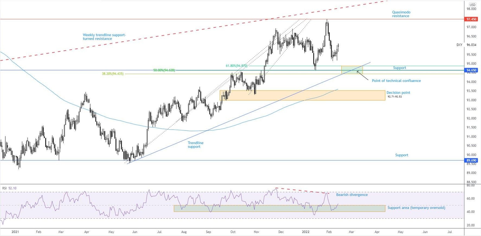 Trend studies reveal a well-defined upward trend since price made contact with support from 89.69 in May (2021), shaped through a series of higher highs and higher lows. The weekly timeframe, nonetheless, shows a long-term range since 2015, fluctuating between 103.82 and 88.25. Rupturing daily support at 94.44-94.87 will, by extension, engulf the 94.63 14th January low and signal an early trend reversal to the downside. Continuation selling, movement overthrowing noted supports, also re-opens the risk of a return to a decision point at 92.71-93.53, an area nearby the 200-day simple moving average at 93.60.