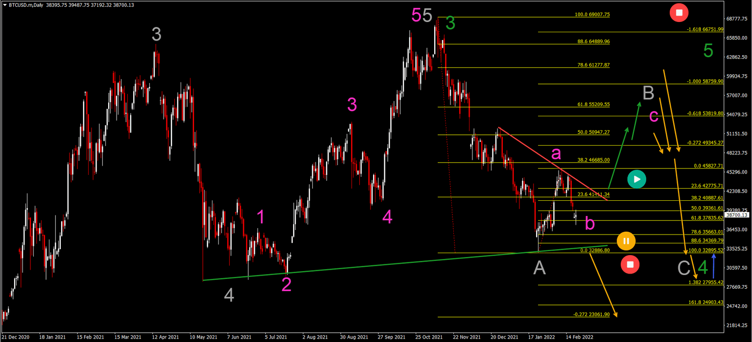 - A bearish decline would confirm the wave C (gray).