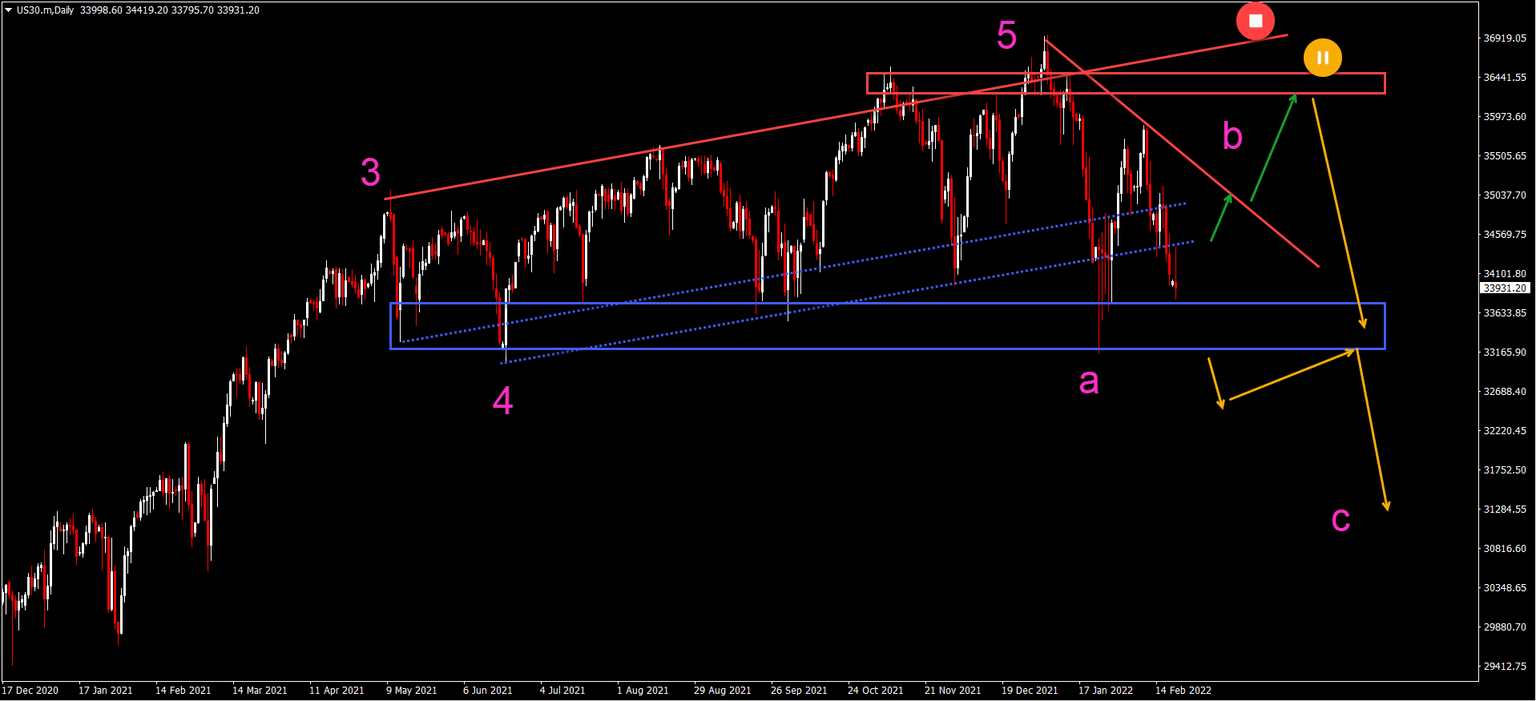 The US30 chart also saw a slight bearish decline, rather than a small bullish bounce. Price action has now reached the key support zone (blue box):