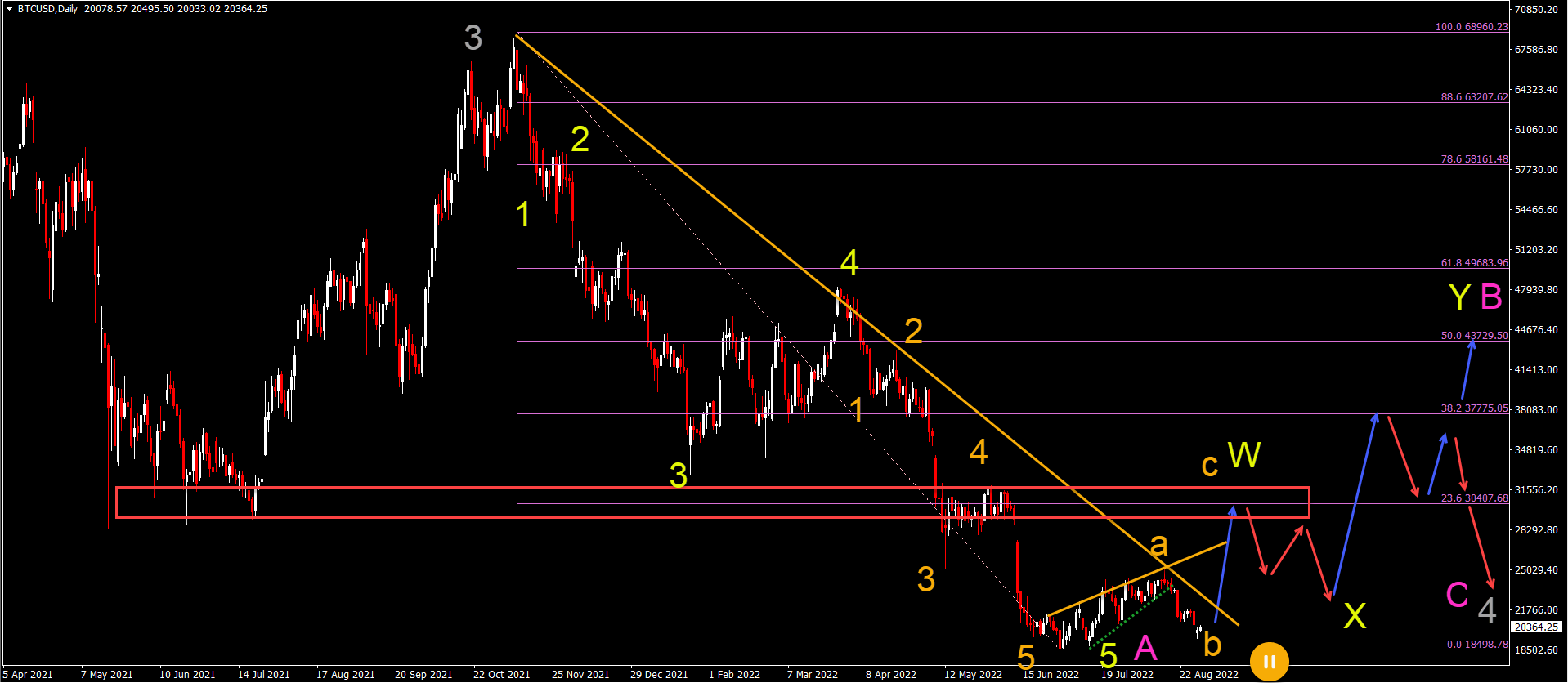 After a bearish retracement in wave X (yellow), a bullish bounce should take price up towards the 38.2% Fibonacci level in a wave Y (yellow).
