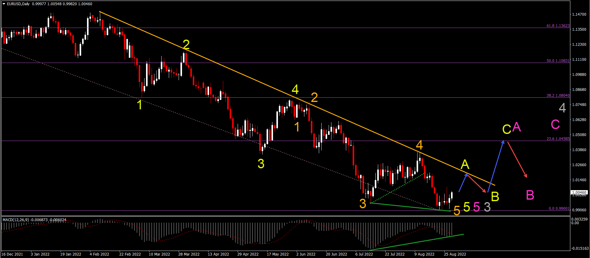 The bullish targets are the 23.6% Fibonacci retracement level near 1.0450 and 38.2% Fib near 1.08 of the wave 4 (gray).