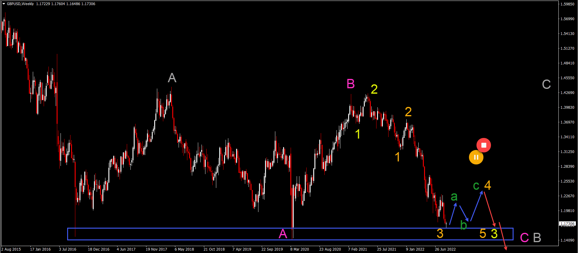 This means that a bullish bounce should take price higher within a wave C (orange).