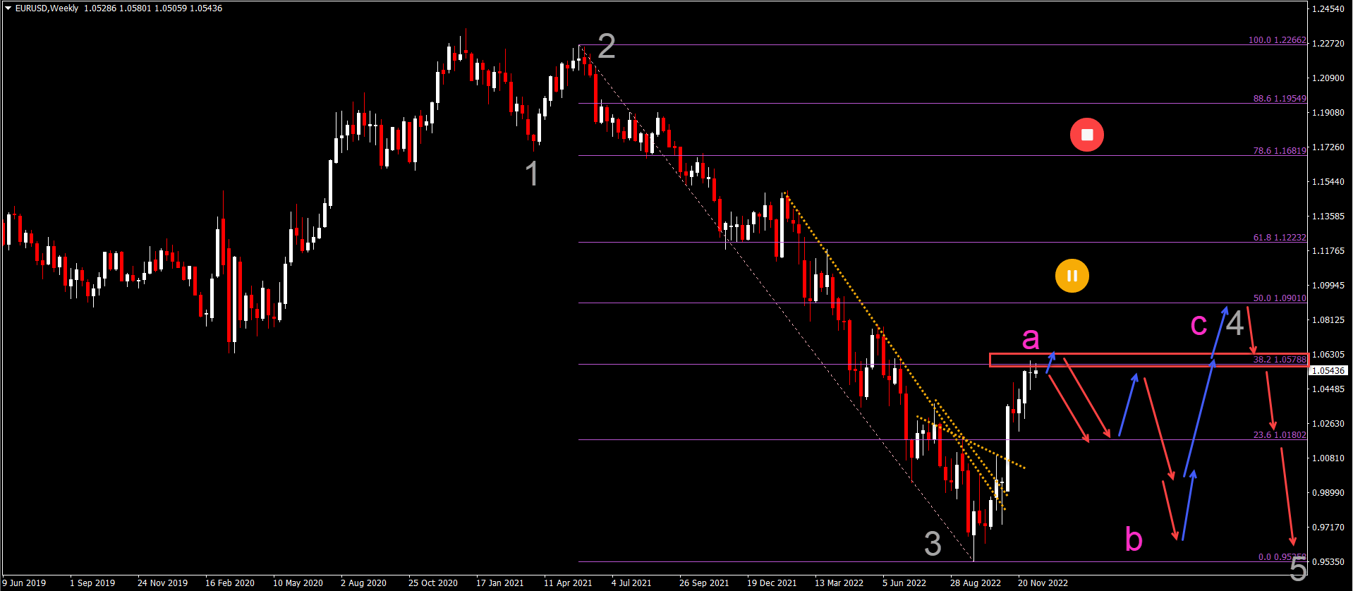 A (pink) as long as price action stays below 1.0750. A bearish ABC could take place within wave B (pink).