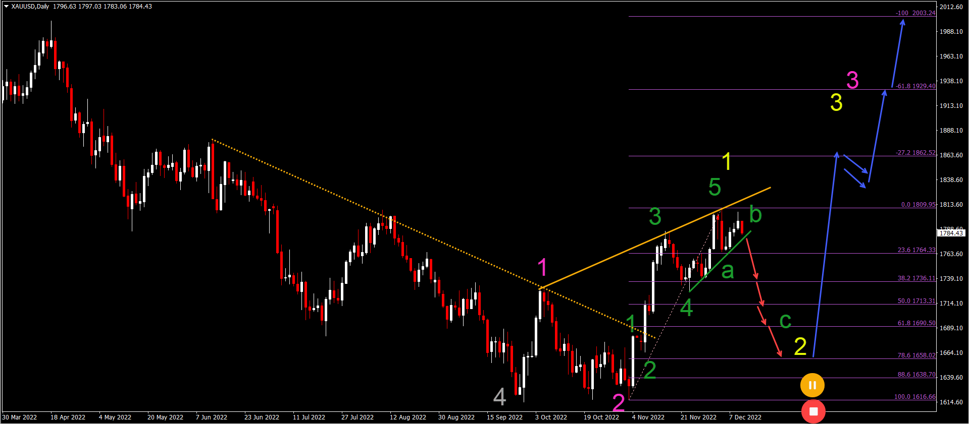 The wave 2 (yellow) remains valid as long as price action remains above the 88.6% Fibonacci level and most importantly, the previous bottom.