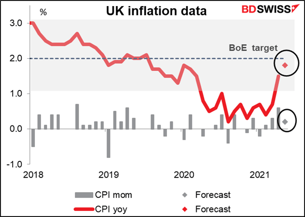 There are a number of major UK indicators out during the week: employment on Tuesday, CPI on Wednesday, and retail sales on Friday. Here it’s the CPI that’s the important point ahead of the June 24th Bank of England meeting. It’s expected to be up 1.8% yoy, almost the mid-point of the Bank’s 1%-3% target range. This should come as no surprise to the Monetary Policy Committee. At their meeting last month they said, “In the central projection, CPI inflation rises temporarily above the 2% target towards the end of 2021, owing mainly to developments in energy prices.” They said this was “transitory” and that they expected inflation to return “to around 2% in the medium term.” Still, hitting the target could tilt them toward a more hawkish stance, which could be positive for GBP.